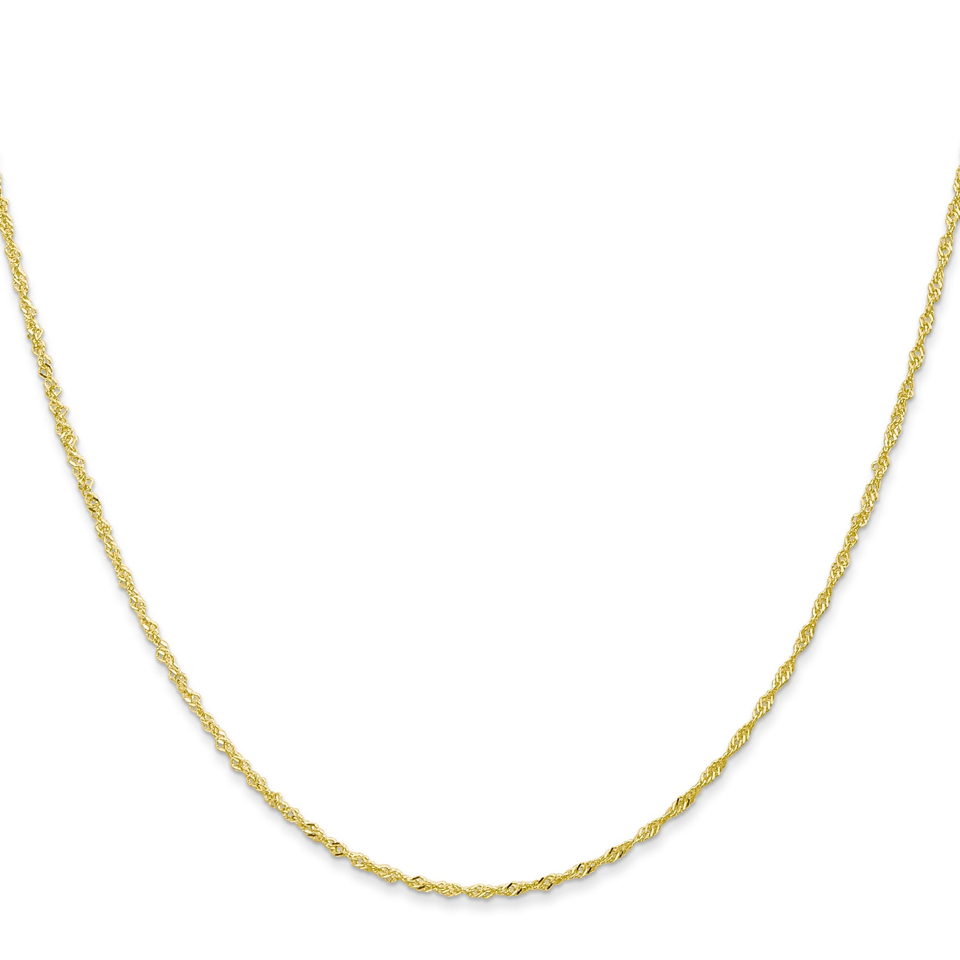 Introducing the 10K Yellow Gold 1.1mm Singapore Chain, a must-have piece for timeless style. Crafted in 10K gold, this polished necklace shines brilliantly with its rich yellow hue. At 22 inches, it graces your neckline effortlessly. The Singapore chain style, known for its interlocking links, adds a touch of sophistication to any look. Measuring 1.1 mm in width, it strikes the perfect balance between delicate and sturdy. The spring ring clasp ensures a secure fit. Elevate your jewelry collection with the enduring charm of the 10K Yellow Gold 1.1mm Singapore Chain.