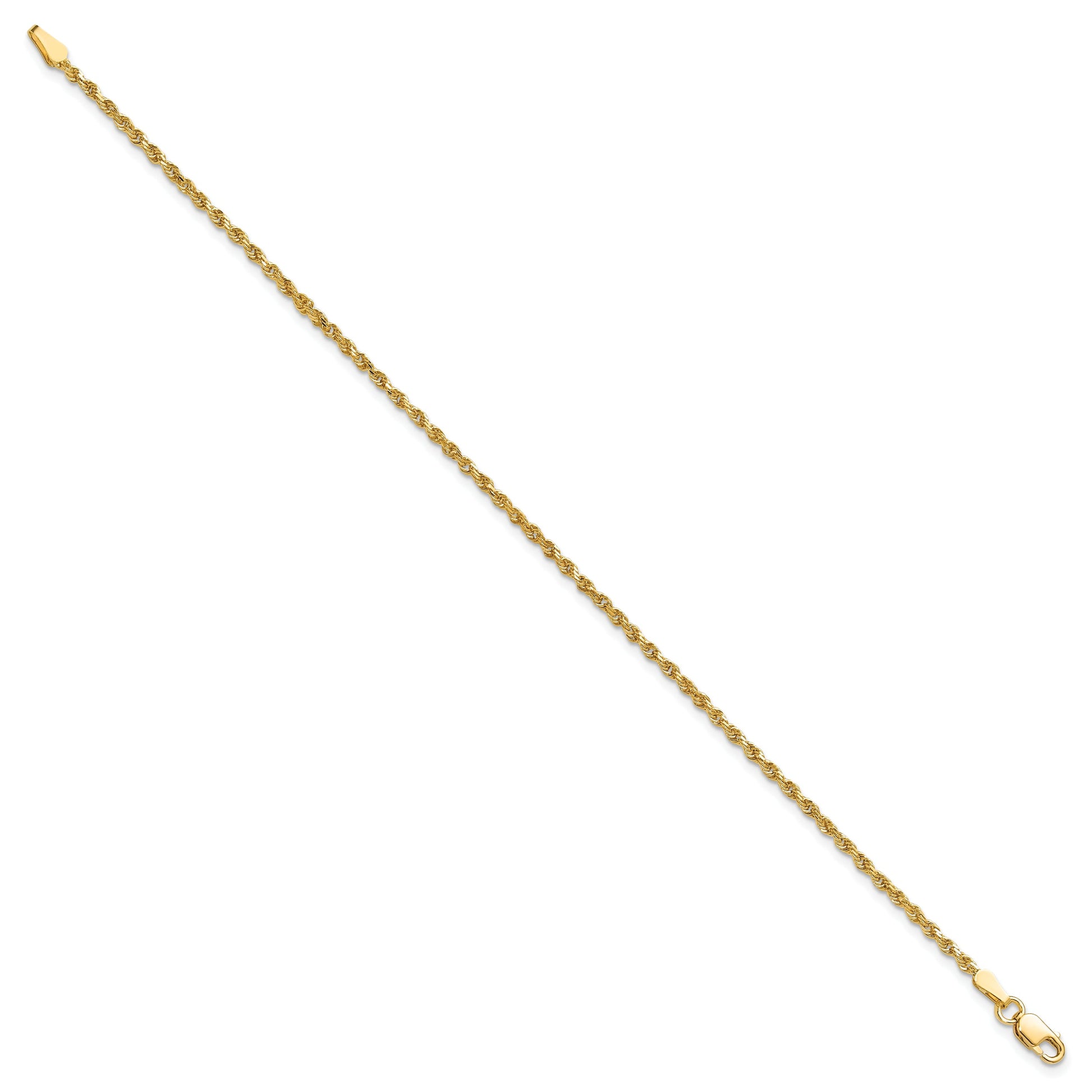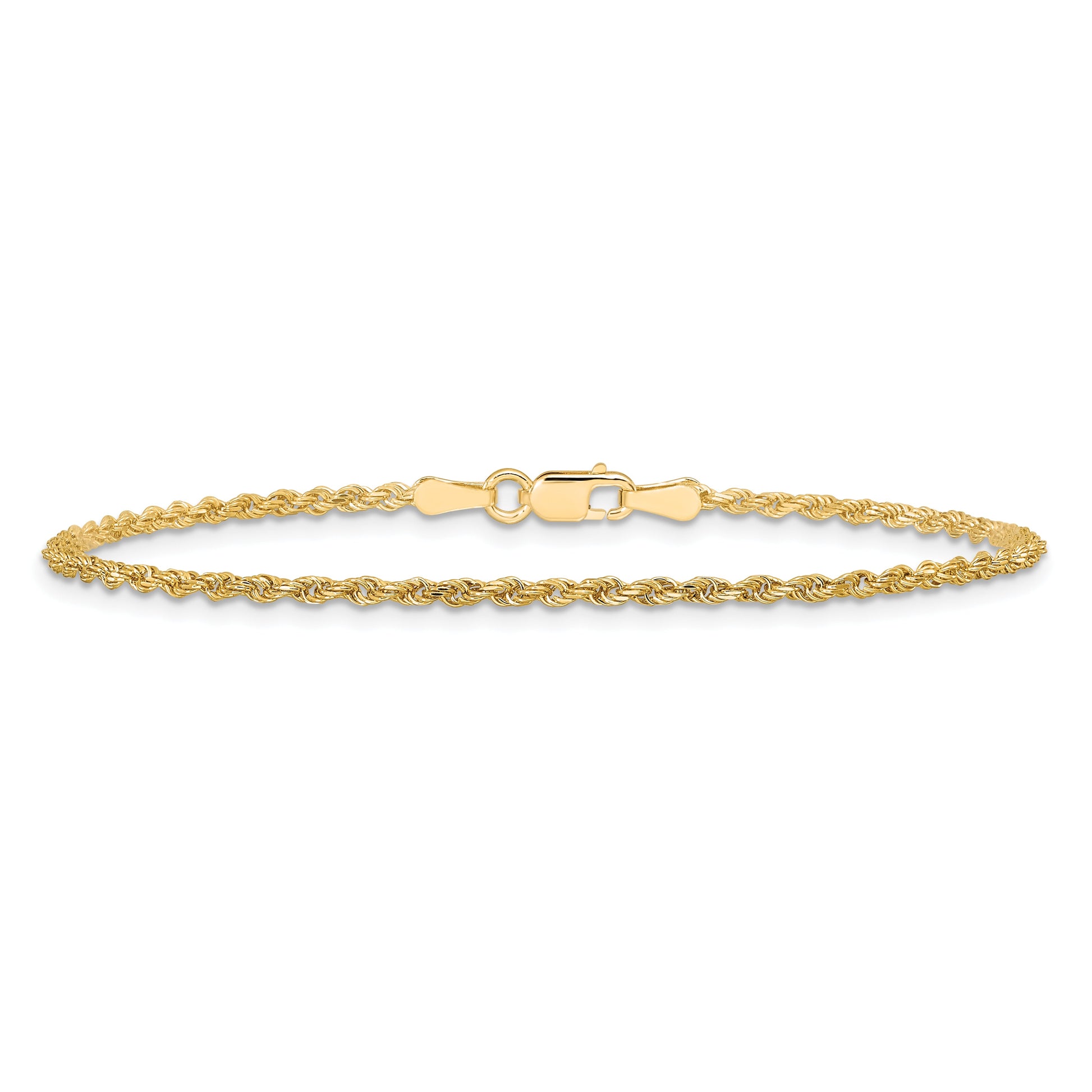 The 10K Yellow Gold 1.75mm Diamond-Cut Rope Chain Anklet is a stunning addition to your jewelry collection. Crafted from high-quality 10K gold, this anklet dazzles with its polished finish and intricate diamond-cut texture. Its delicate 1.75mm rope design exudes elegance and sophistication, while the solid structure ensures durability. Featuring a secure lobster clasp, this anklet promises to stay in place, perfectly complementing any outfit. With its gleaming yellow gold hue, the 10K Yellow Gold 1.75mm Diamond-Cut Rope Chain Anklet transforms casual or formal attire into a statement of timeless style.