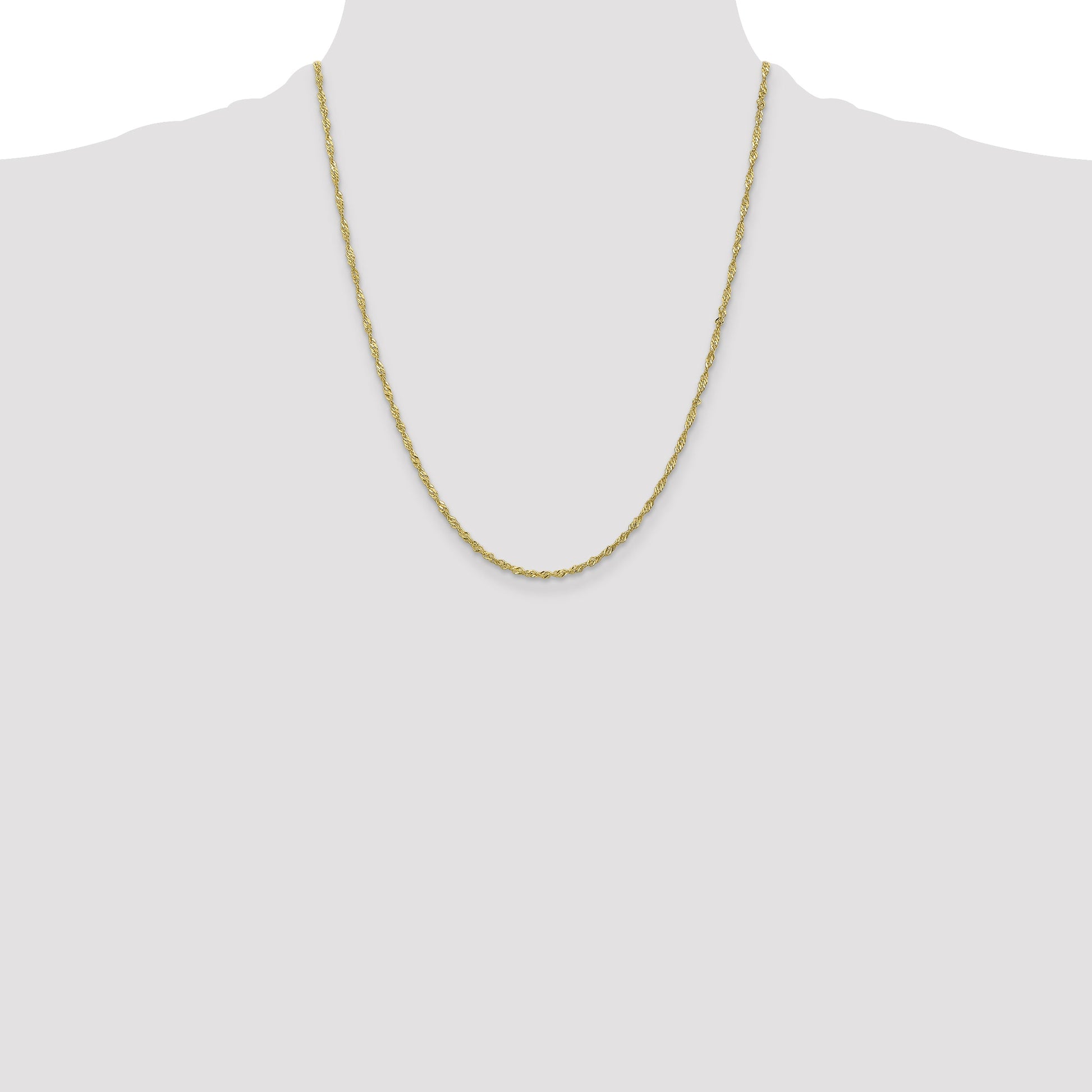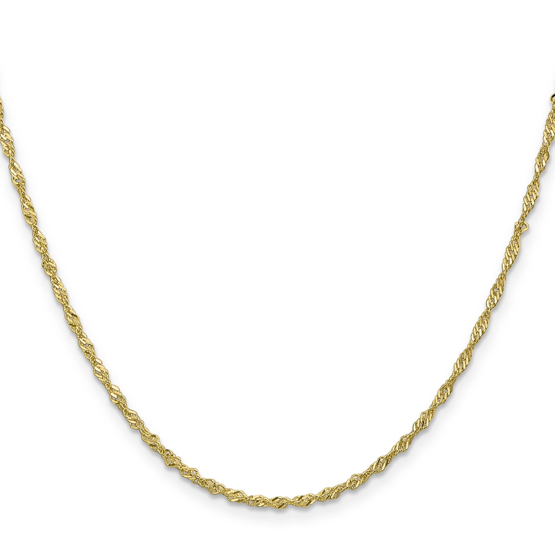 The 10K Yellow Gold 1.7mm Singapore Chain is a true classic. Its timeless design showcases polished yellow gold that catches the light beautifully. Crafted with a solid 10K purity, this necklace promises both elegance and durability. Measuring 22 inches in length, the delicate 1.7mm width highlights the intricacy of the Singapore chain while remaining lightweight. A lobster clasp ensures security and ease of wear. Ideal for any occasion, the 10K Yellow Gold 1.7mm Singapore Chain adds a touch of sophistication to your look, making it a must-have in any jewelry collection.