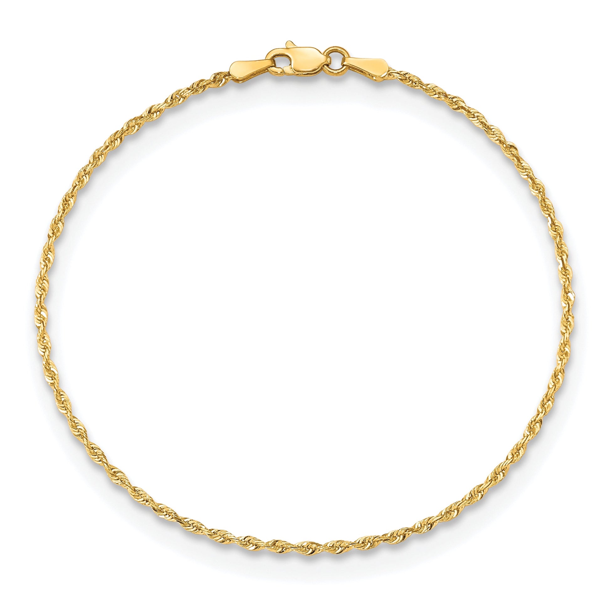 The 10K Yellow Gold 1.85mm D/C Quadruple Rope Chain Anklet is a stunning piece of jewelry that adds a touch of elegance to any outfit. Crafted from solid 10K gold, this anklet features a polished finish and a diamond-cut texture that catches the light beautifully. Its rope chain design measures a comfortable 10 inches in length, making it versatile for various styles. The 1.85mm width ensures a delicate yet eye-catching presence on the ankle. Secured with a lobster clasp, this anklet promises durability and style. Enhance your jewelry collection with this timeless 10K Yellow Gold 1.85mm D/C Quadruple Rope Chain Anklet.