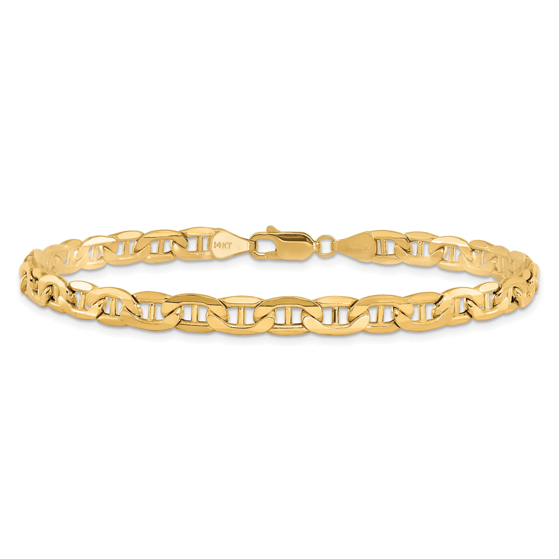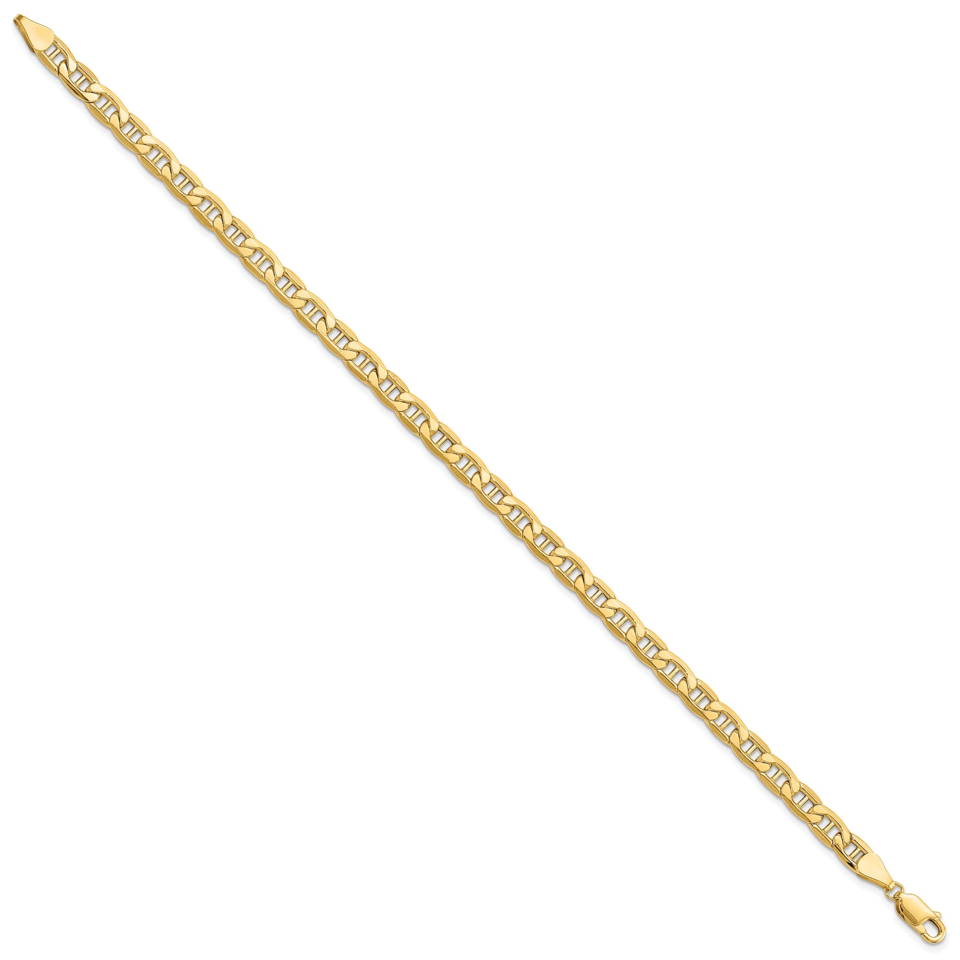 The 10K Yellow Gold 5.5mm Semi-Solid Anchor Chain is a stunning piece of jewelry that exudes elegance and charm. Made from 10-karat gold, this chain offers a high-quality, polished finish that catches the light beautifully. With a length of 9 inches, it sits comfortably and securely on the wrist, thanks to its sturdy lobster clasp. The anchor design gives this bracelet a bold, unisex appeal, perfect for anyone who loves timeless style. Machine-cast for precision, the 5.5mm width ensures a substantial feel without being too heavy. Elevate your look effortlessly with the 10K Yellow Gold 5.5mm Semi-Solid Anchor Chain.
