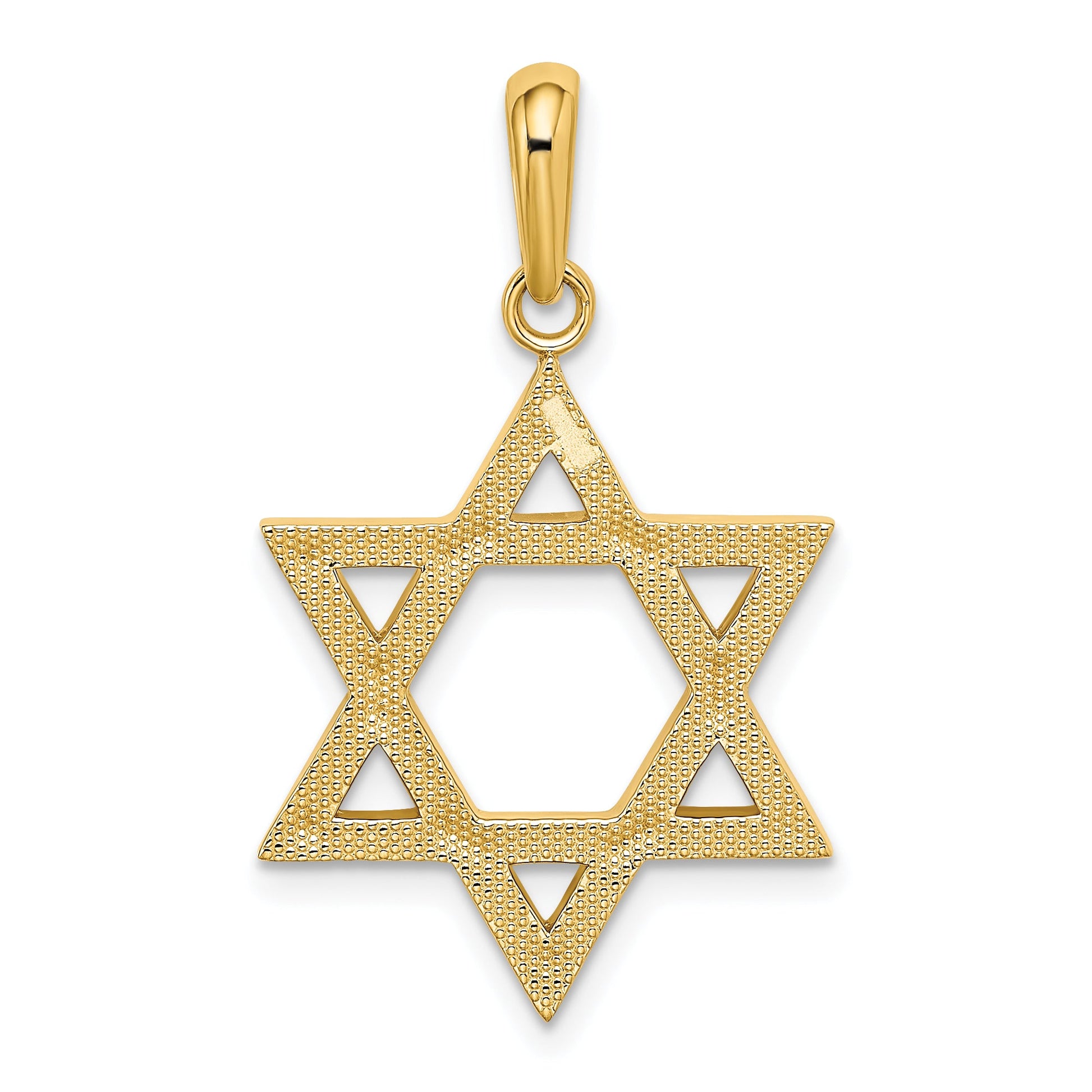 The 10K Yellow Gold Star of David Pendant is an elegant piece of jewelry that exudes timeless grace. Crafted from 10K solid gold, this pendant showcases a polished, gleaming finish that captures light beautifully. The pendant measures 33mm in length, while the Star of David charm itself is 21.06mm long and 18.29mm wide, making it a striking accessory for any occasion. This themed pendant is a testament to both exquisite taste and meaningful symbolism. Elevate your style with the enduring beauty of the 10K Yellow Gold Star of David Pendant.