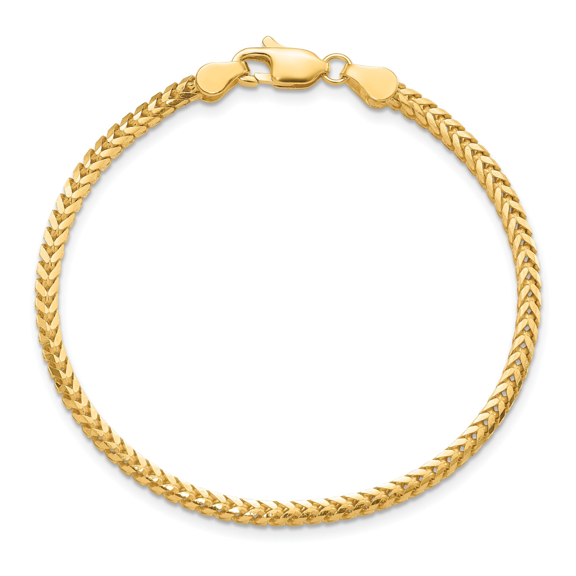 The 10K Yellow Gold 2.5mm Franco Chain bracelet is a timeless piece crafted with precision and style. Made from 10K yellow gold, this bracelet features a polished finish that adds a rich gleam to your wrist. The 2.5mm width and Franco chain design ensure durability while maintaining elegance. With a solid structure achieved through die-struck techniques, this bracelet offers a blend of strength and beauty. The lobster clasp secures it snugly. Perfect for any occasion, the 10K Yellow Gold 2.5mm Franco Chain bracelet makes an ideal addition to both men's and women's jewelry collections.