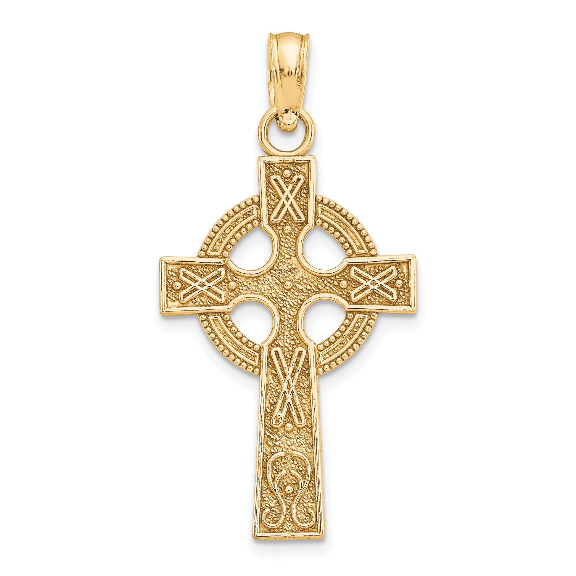 The 10K Yellow Gold Celtic Cross with Eternity Circle Pendant is a stunning blend of tradition and style. Made from polished 10K gold, this pendant exudes timeless beauty. The elegant Celtic cross measures 23 mm in length and 14 mm in width, while the eternity circle provides a touch of infinity to the piece. With a solid and textured finish, it adds depth and character. Perfectly crafted through the precise casting process, this pendant is 28 mm in total length with a 5 mm bail length. Elevate your look with this intricately designed 10K Yellow Gold Celtic Cross with Eternity Circle Pendant.