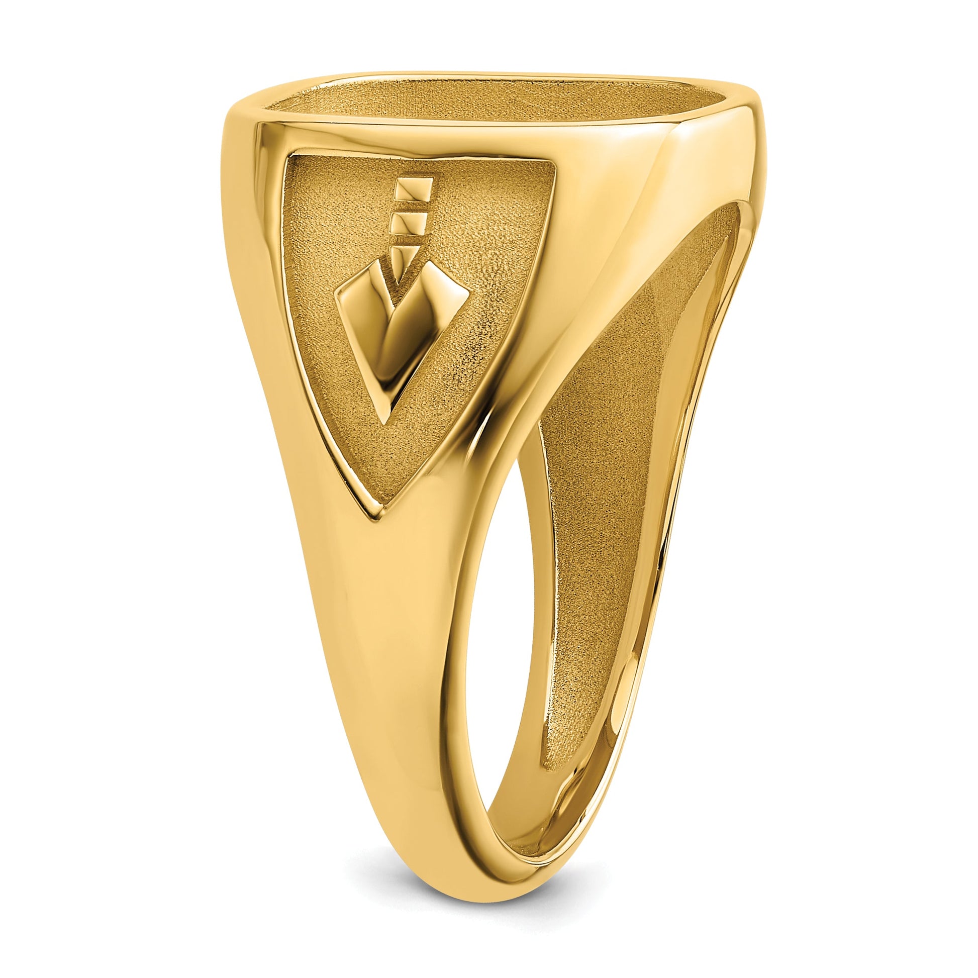 The 10K Yellow Gold Men's Polished and Textured Masonic Ring Mounting offers a unique blend of elegance and style for the modern gentleman. Crafted from high-quality 10K yellow gold, it provides a polished finish with exquisite textures. This ring showcases a 14.00 x 12.00 mm center stone mounting in an irregular shape, though stones are not included. The band narrows from 15.4 mm to 3 mm for added comfort and sophistication. Designed with a solid profile, this Masonic-themed ring mounting is perfect for those seeking to create a personal statement piece.