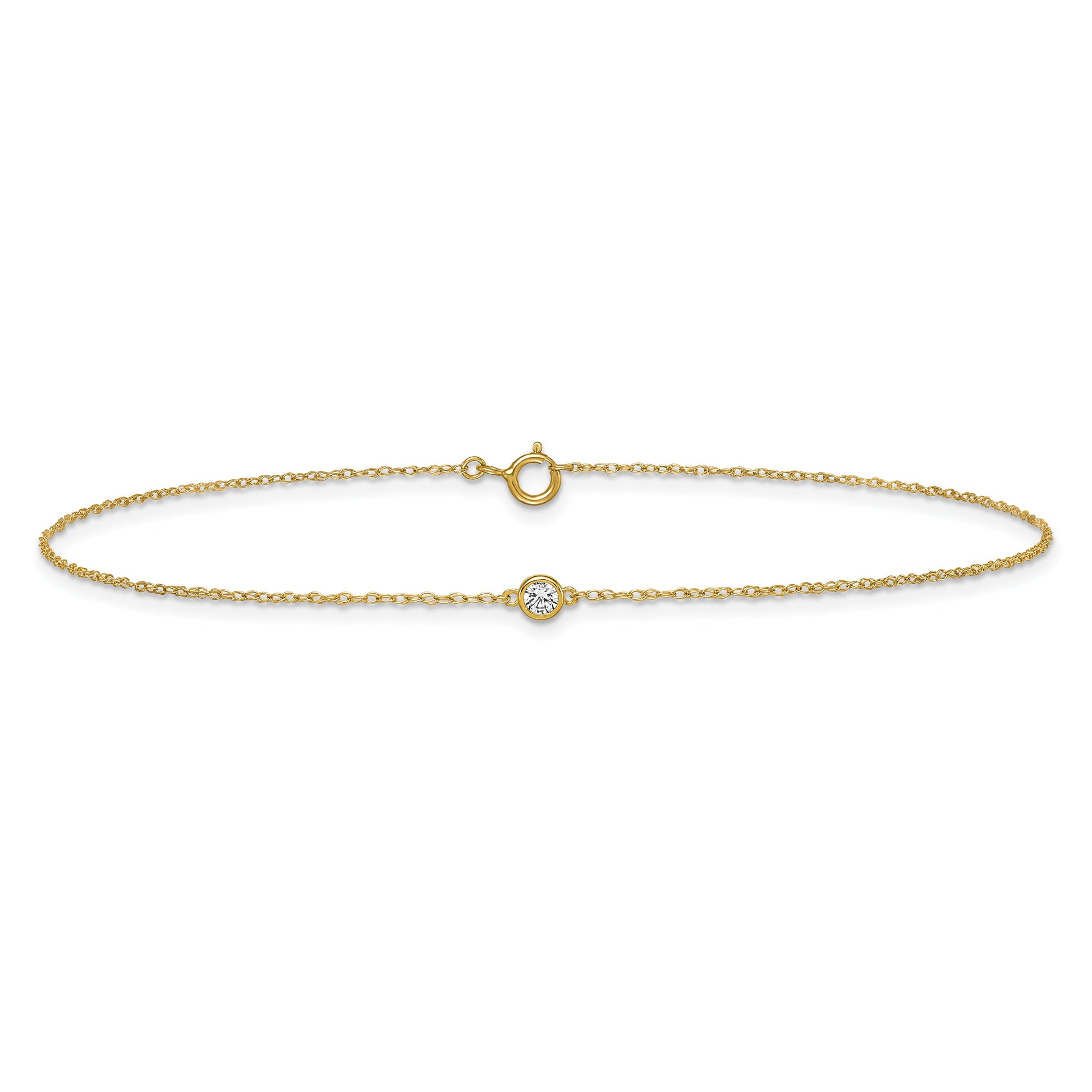Introducing the 10K Yellow Gold Polished Bezel-Set Cz 10 Inch Anklet, a perfect blend of elegance and charm. Crafted with high-quality 10K yellow gold, this anklet features a stunning bezel-set round cubic zirconia, offering the brilliance of a diamond at a fraction of the cost. The delicate cable chain, measuring 1 mm in width, ensures a comfortable fit, while the spring ring clasp provides security and ease of wear. Its unisex design allows anyone to enjoy its style. Dress up any outfit with the timeless appeal of this 10K Yellow Gold Polished Bezel-Set Cz Anklet today.