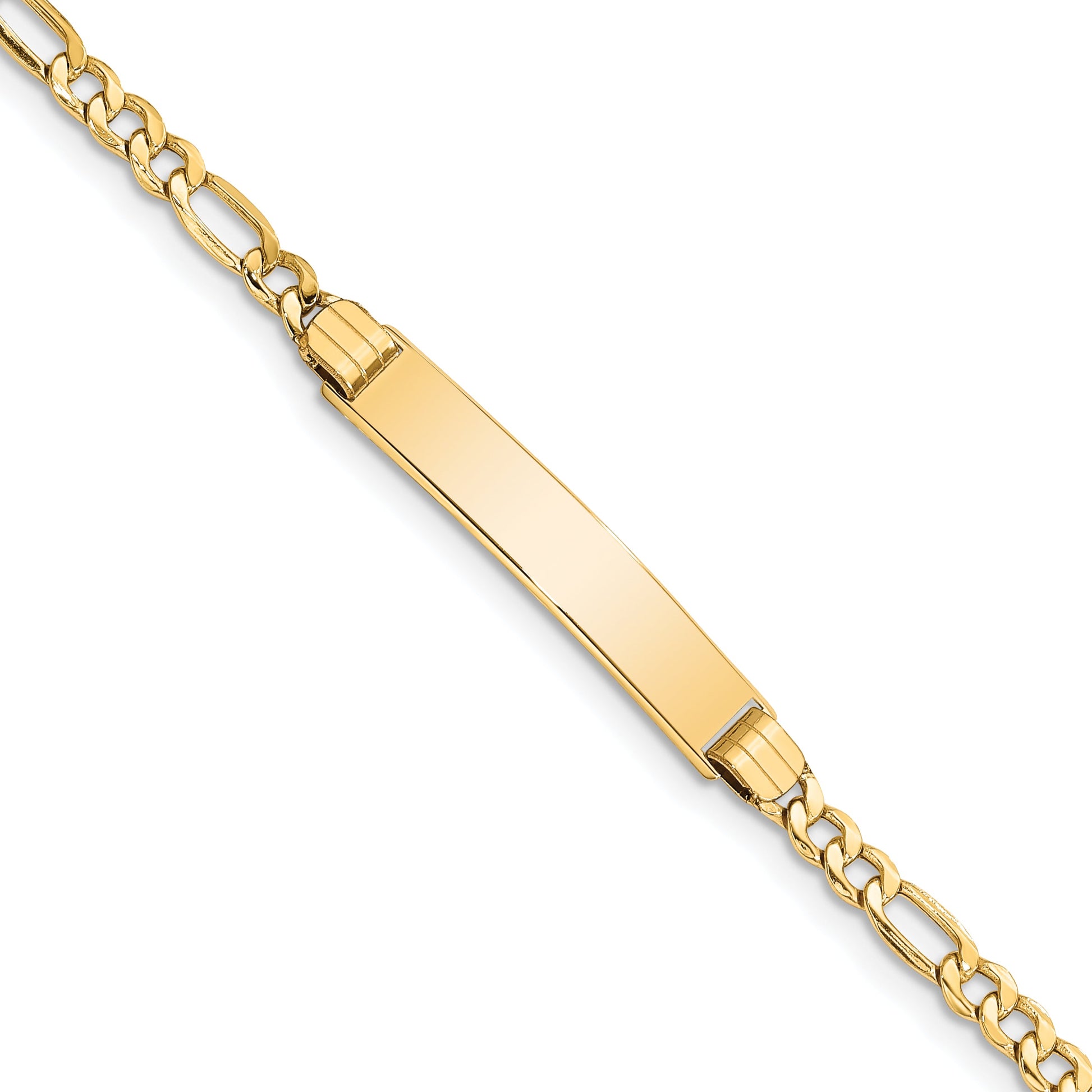 Introducing the elegant 10K Yellow Gold Semi-Solid Figaro Link ID Bracelet. Crafted with 10K gold, this 8-inch long piece features a classic Figaro chain, 3.2 mm in width, and a stylish lobster clasp for secure wear. The bracelet boasts a customizable ID plate, allowing you to engrave a name or special message. Measuring 29.19 mm by 5.8 mm, the plate offers ample space for personalization. This versatile bracelet is not just an accessory; it’s a statement of sophistication and sentiment. Elevate your jewelry collection with this timeless 10K Yellow Gold Semi-Solid Figaro Link ID Bracelet.