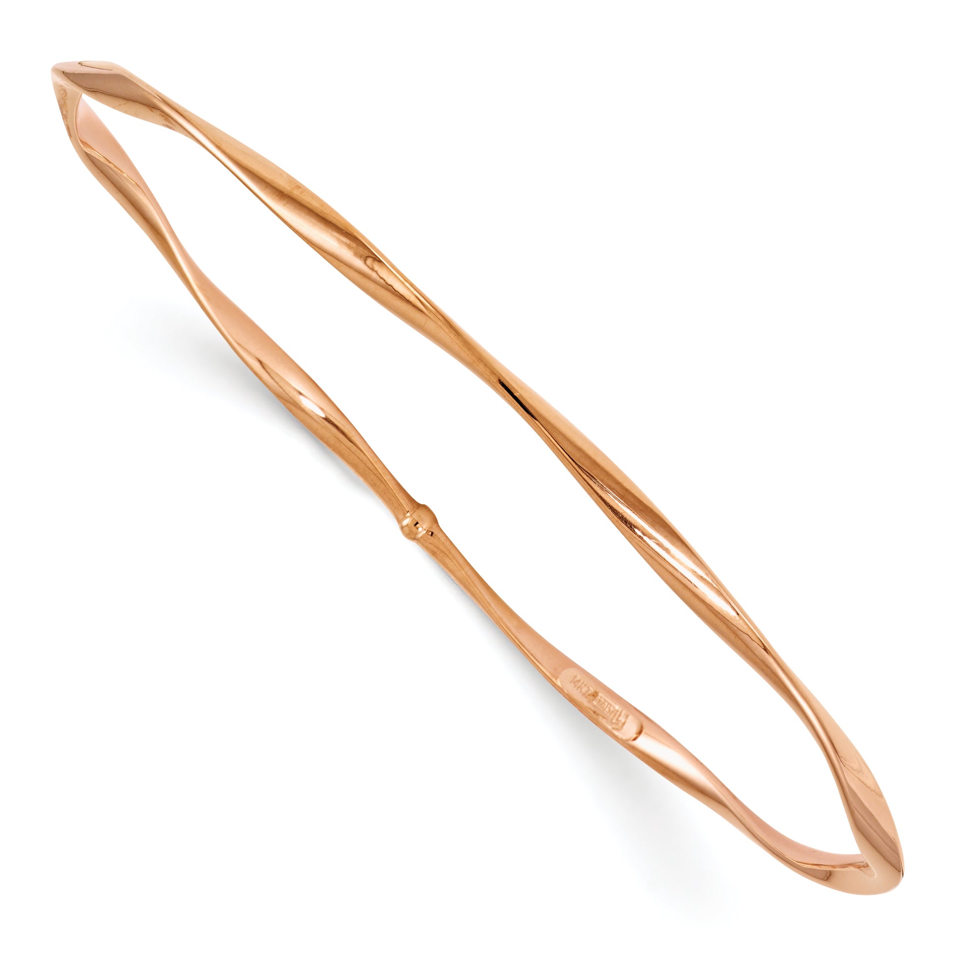Elevate your style with the 14K Rose Gold Polished Twisted Slip-On Bangle. Crafted from pure 14K rose gold, this exquisite piece offers a refined polished look while the twisted design adds a touch of sophistication. The slip-on style makes it easy to wear, with no pesky clasps to deal with, ensuring a seamless fit on your wrist. Its hollow structure offers lightweight comfort without compromising elegance. With a width of 2.5 mm, this bangle is dainty yet noticeable. Enjoy peace of mind with a lifetime guarantee on this timeless 14K Rose Gold Polished Twisted Slip-On Bangle.