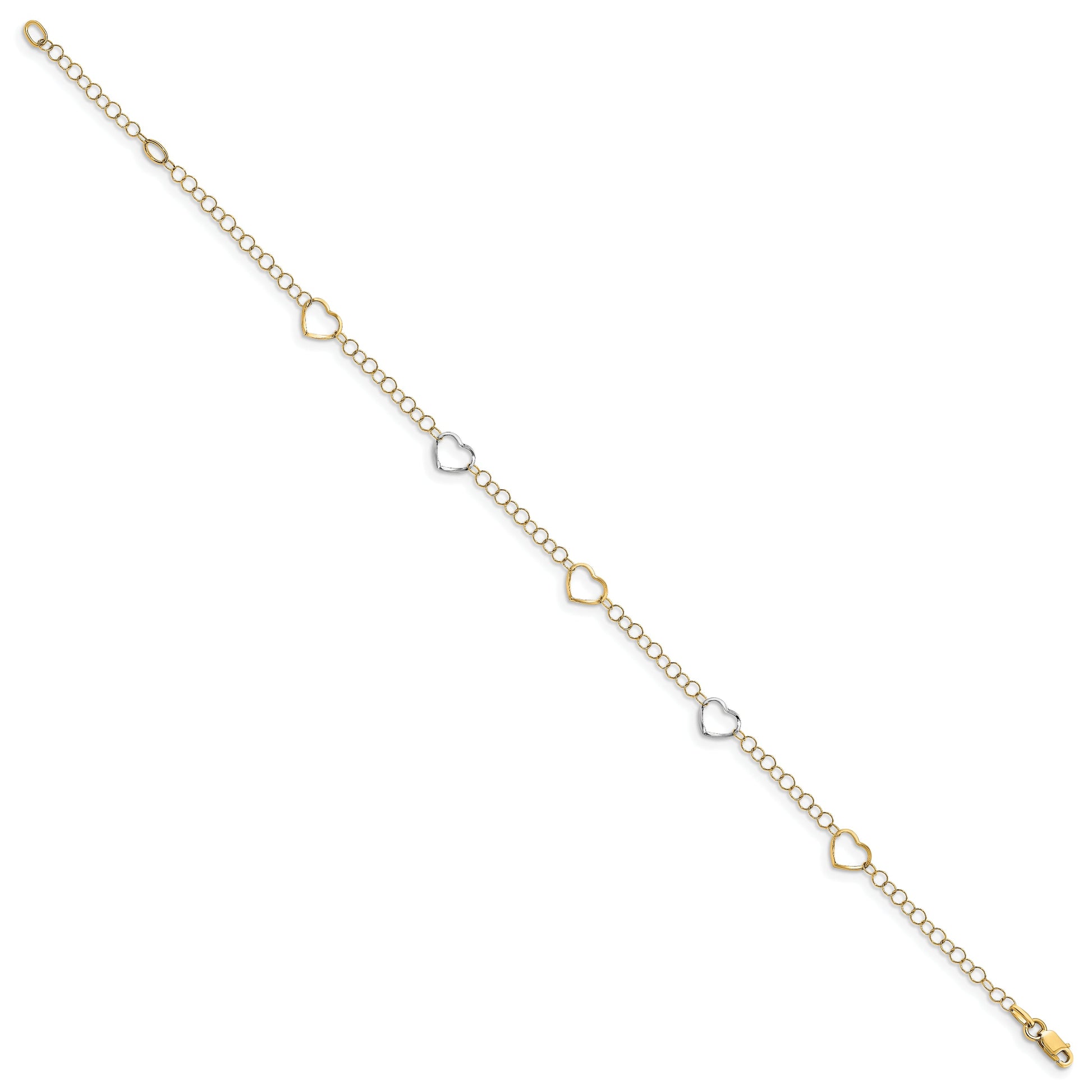 The 14K Two-Tone Polished Heart Anklet is a charming piece that elevates any ensemble. Crafted from fine 14K gold, this anklet offers a shiny two-tone finish, adding a touch of elegance. Its 9-inch cable chain, extending an extra inch, allows for versatile wear, while the 3 mm width speaks to both its delicate beauty and durability. A polished heart charm, machine-made with precision, hangs gracefully. The lobster clasp ensures a secure fit, making it a reliable accessory. This anklet, backed by a lifetime warranty, promises enduring style. Embrace timeless allure with the 14K Two-Tone Polished Heart Anklet.