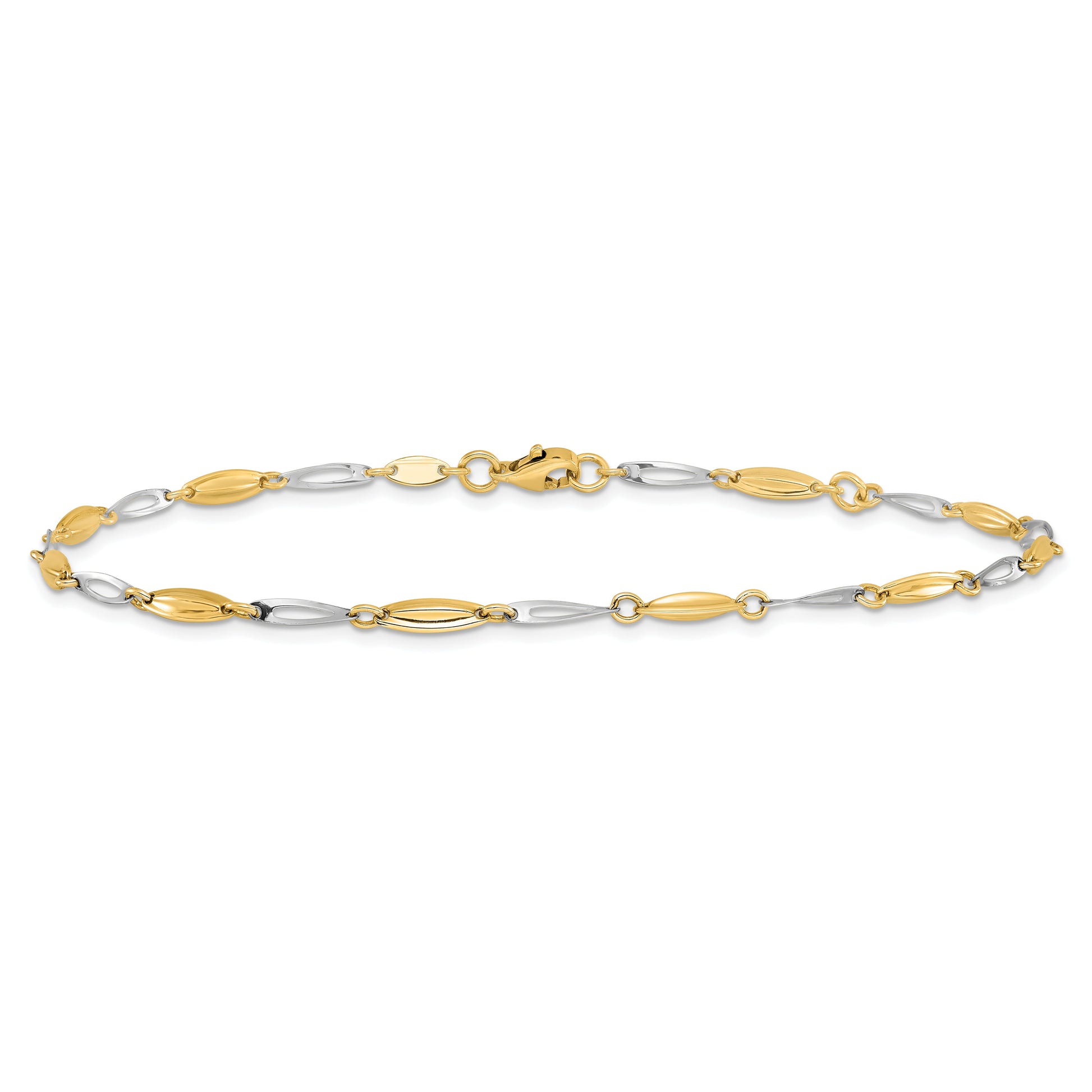The 14K Two-Tone Polished Anklet with 1-Inch Extender captures elegance with its polished finish and versatile design. Crafted from 14K gold, this anklet combines classic charm and modern style. The two-tone finish highlights an eye-catching contrast, while its 9-inch semi-solid chain provides a comfortable fit secured by a reliable lobster clasp. Extend the enjoyment with an additional inch, allowing for effortless styling. Made with meticulous stamping techniques, this anklet promises timeless quality. Perfect for the fashion-forward woman, this 14K Two-Tone Polished Anklet offers both allure and durability, enhanced by a lifetime guarantee.