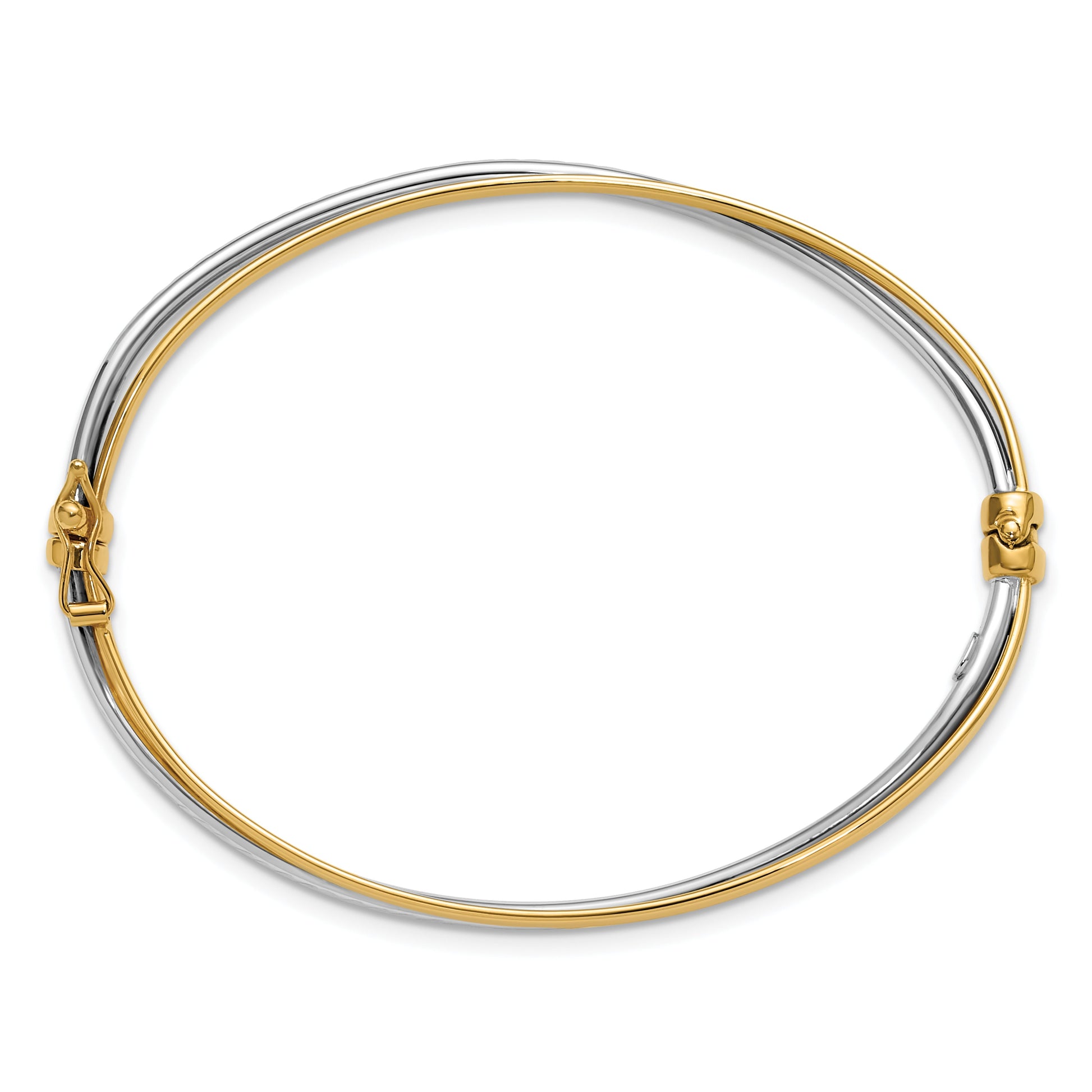 Elevate your style with the 14K Two-Tone, Rhodium-Polished and Diamond-Cut Twist Hinged Bangle. Crafted from genuine 14K gold, this bracelet features a sleek two-tone finish with sparkly rhodium accents that catch the light beautifully. Its diamond-cut texture adds a touch of elegance, while the hinged design ensures a perfect fit and easy wear. The safety clasp keeps the bangle secure, making it ideal for daily use or special occasions. The 14K Two-Tone, Rhodium-Polished, and Diamond-Cut Twist Hinged Bangle truly combines style and quality that lasts a lifetime.