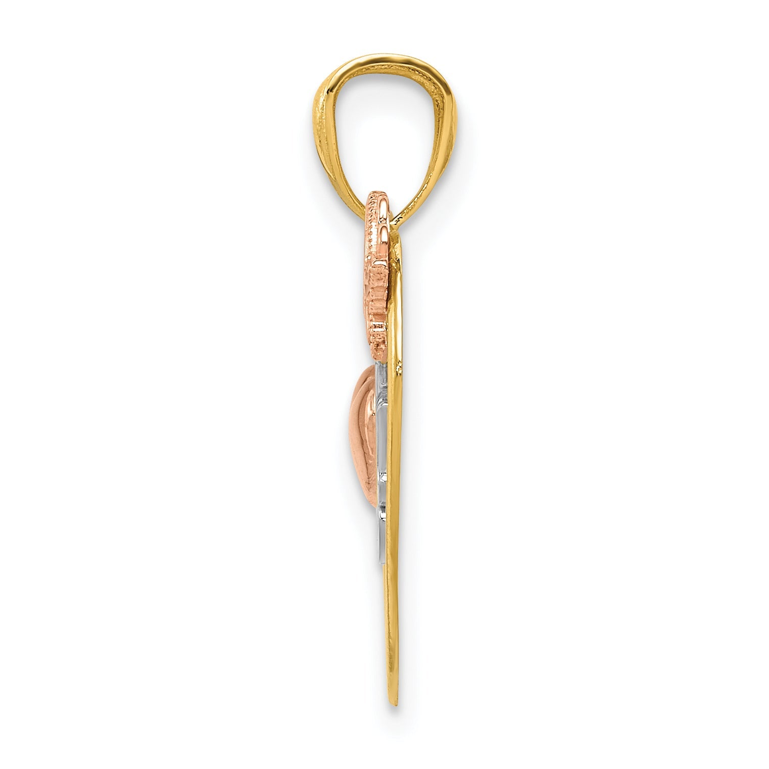 The 14K Two-Tone "I Love You" Heart with Butterfly Pendant captures love and beauty in striking detail. Crafted from 14K gold, this polished pendant features a charming butterfly nestled on a heart. The rhodium accents enhance the silver tone, adding a touch of elegance. Its design is solid and durable, finished with a textured back for added detail. The pendant measures 20.4 mm in length and 17.5 mm in width, making it a perfect size for daily wear. Celebrate love with the 14K Two-Tone "I Love You" Heart with Butterfly Pendant.