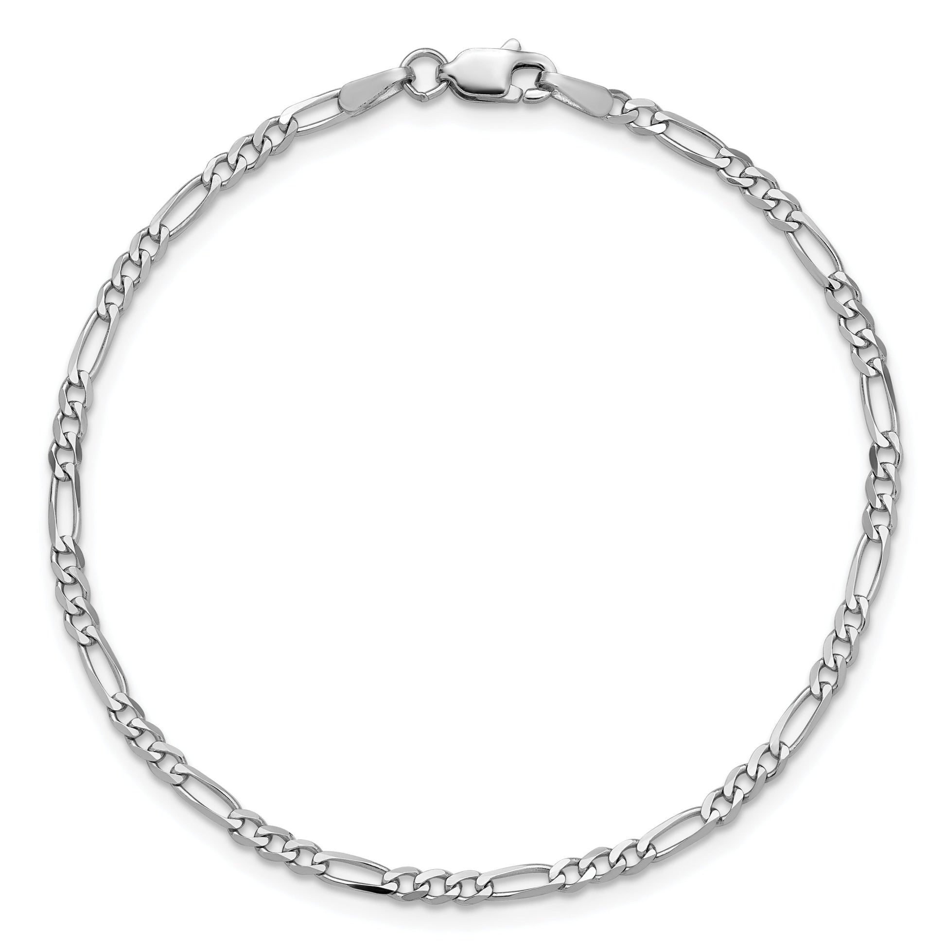 Add a touch of elegance to your ankle with the 14K White Gold 10 Inch 2.25mm Flat Figaro Anklet. Crafted from polished white gold, this anklet adds a hint of luxury to any outfit. The 10-inch Figaro chain, with a width of 2.25mm, showcases a sleek profile perfect for any occasion. Its rhodium plating ensures lasting shine, while the sturdy lobster clasp keeps it securely in place. Designed for women who appreciate timeless beauty, this finely cast piece is machine-made for consistent quality. Elevate your style with the 14K White Gold Figaro Anklet today.