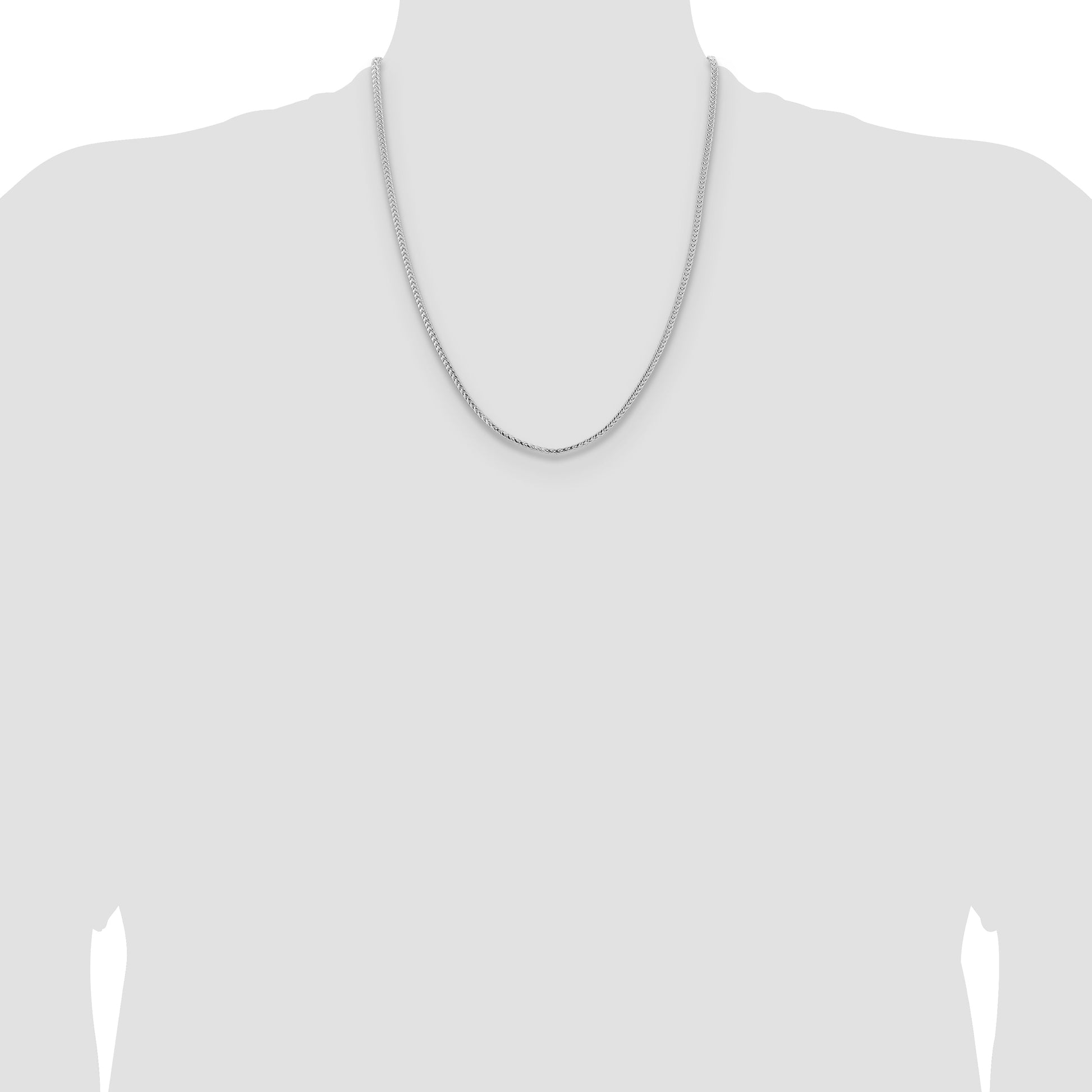 The 14K White Gold 14K 22 Inch 3mm Franco With Fancy Lobster Clasp Chain is a sleek addition to any jewelry collection. Crafted from solid 14K white gold and polished to perfection, this chain offers a bright, sparkling finish thanks to rhodium plating. At 22 inches long and 3mm wide, it hits the perfect balance of style and comfort. The sturdy lobster clasp ensures secure wear while adding a touch of sophistication. This machine-made necklace is designed for women who want a classic, durable piece that can elevate any look. The 14K White Gold 14K 22 Inch 3mm Franco with Fancy Lobster Clasp Chain promises quality and style in every detail.
