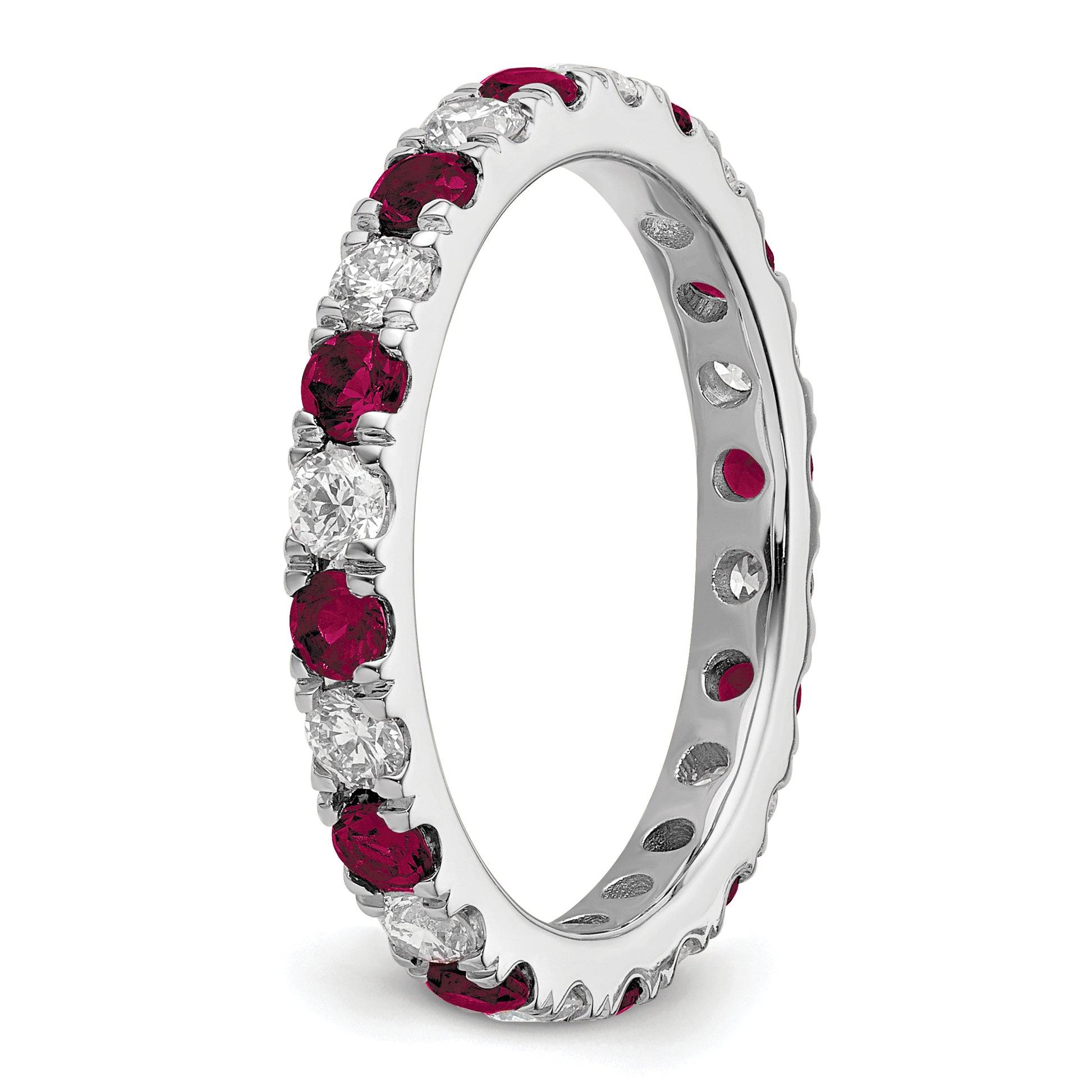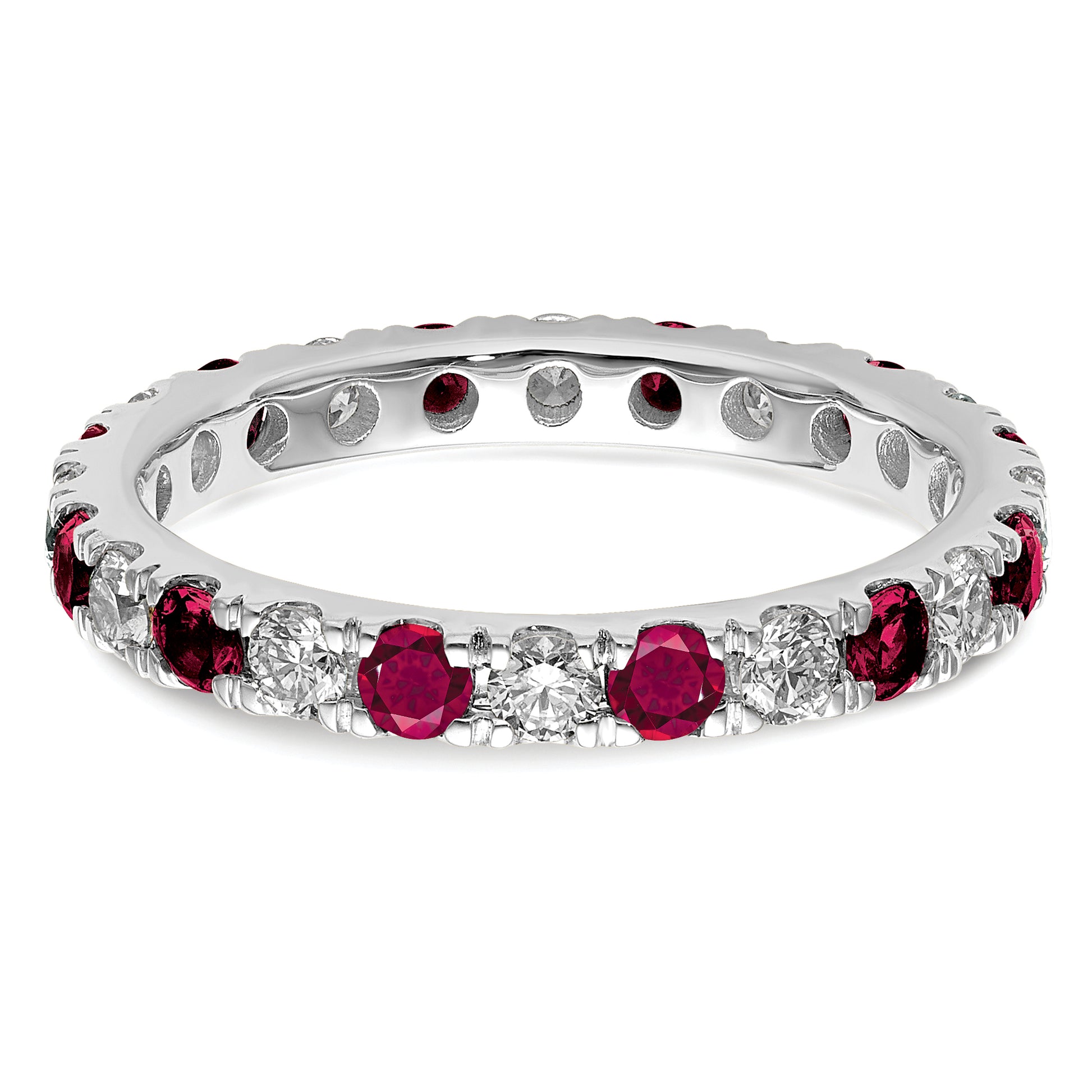 Discover the timeless charm of our 14k White Gold 3/4 Ct. Lab Grown Diamond and Lab Created Ruby Eternity Band Ring. Meticulously crafted, this ring features a seamless blend of lab-created rubies and diamonds. The gemstones dazzle in red and brilliant white, set in polished white gold. Each gem is round-cut, promising maximum brilliance. With its solid craftsmanship and premium rhodium plating, the ring offers outstanding durability and a sleek look. The band has a comfortable 2.65 mm width, perfect for everyday glamour. Wear the 14k White Gold 3/4 Ct. Lab Grown Diamond and Ruby Eternity Band Ring for an everlasting sparkle.