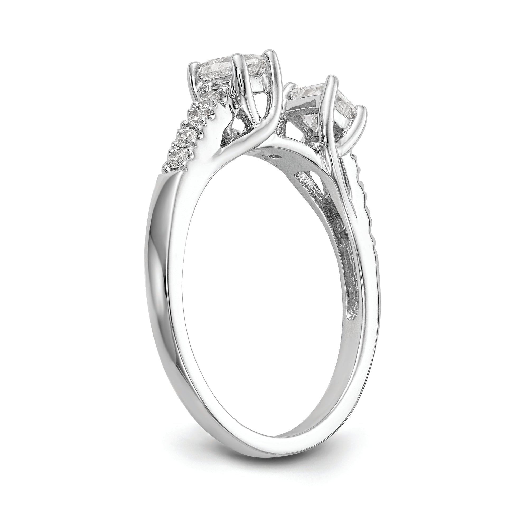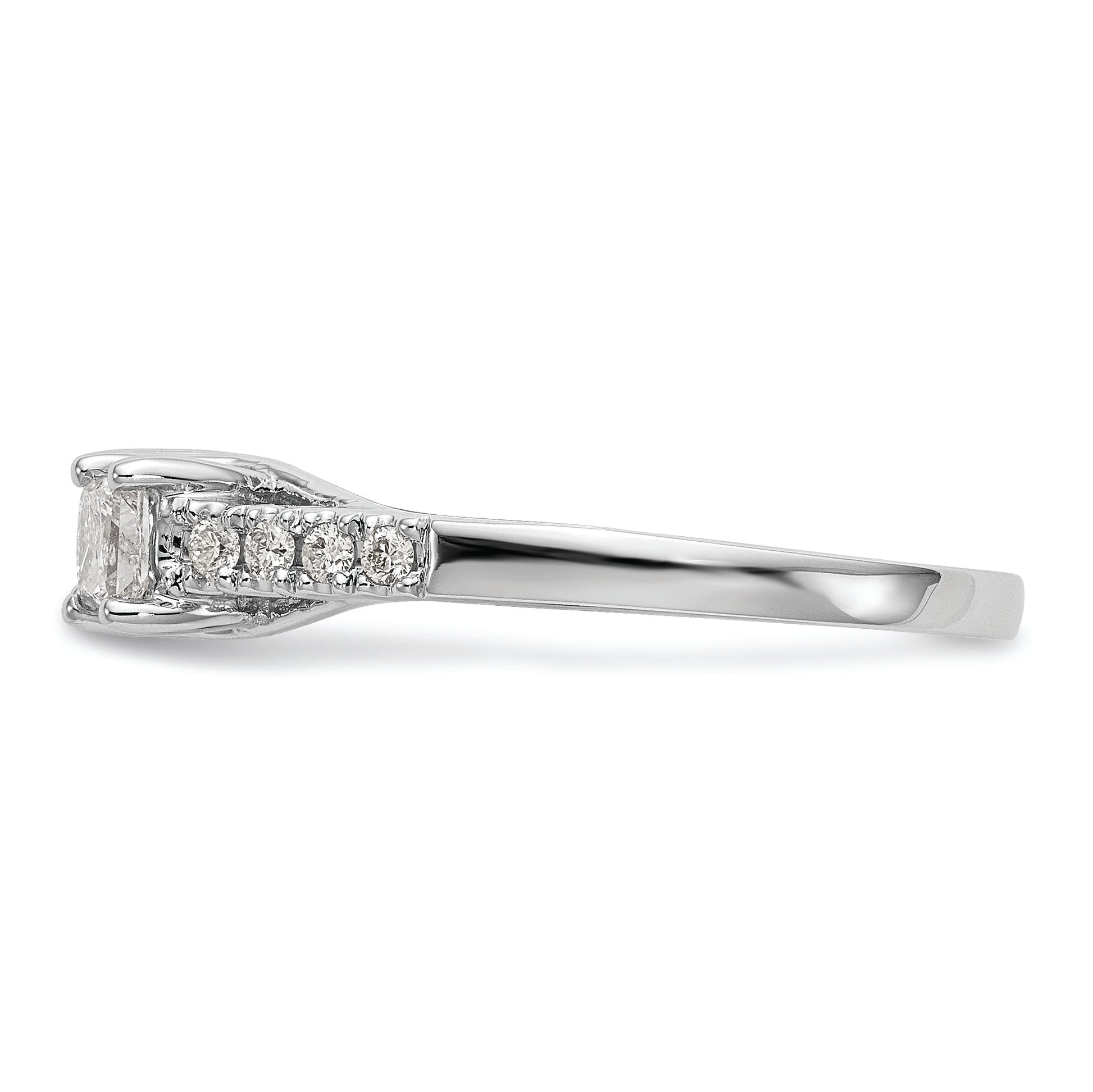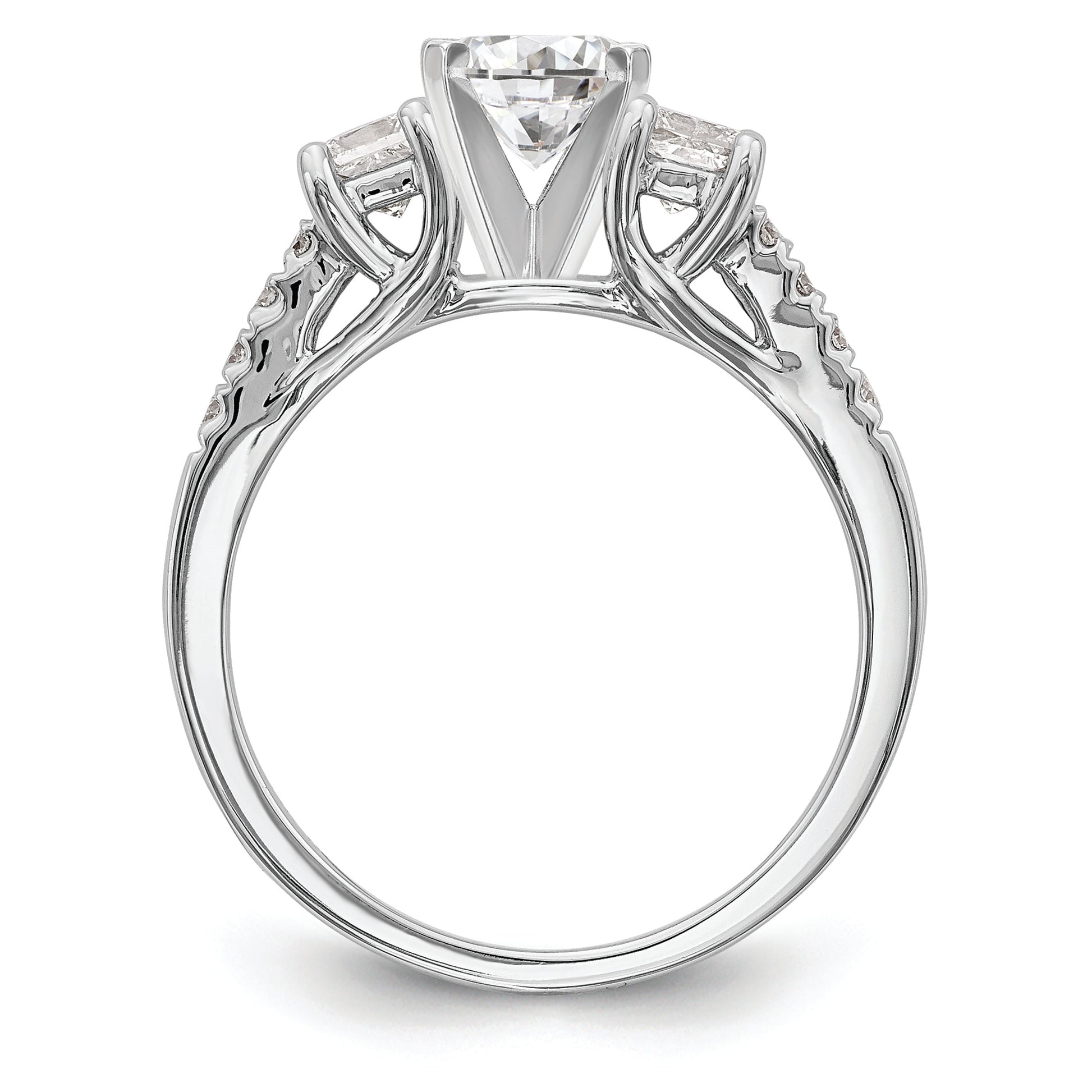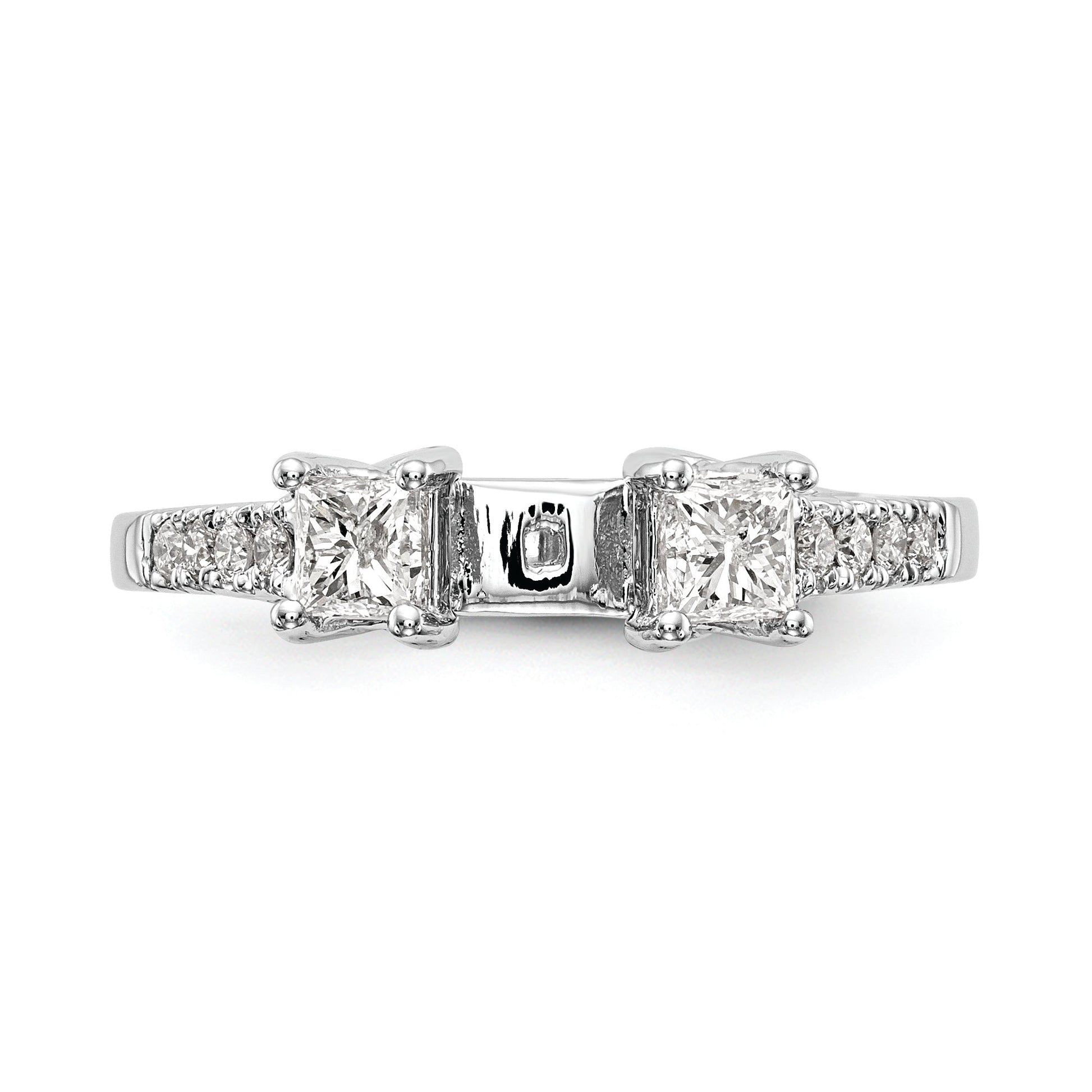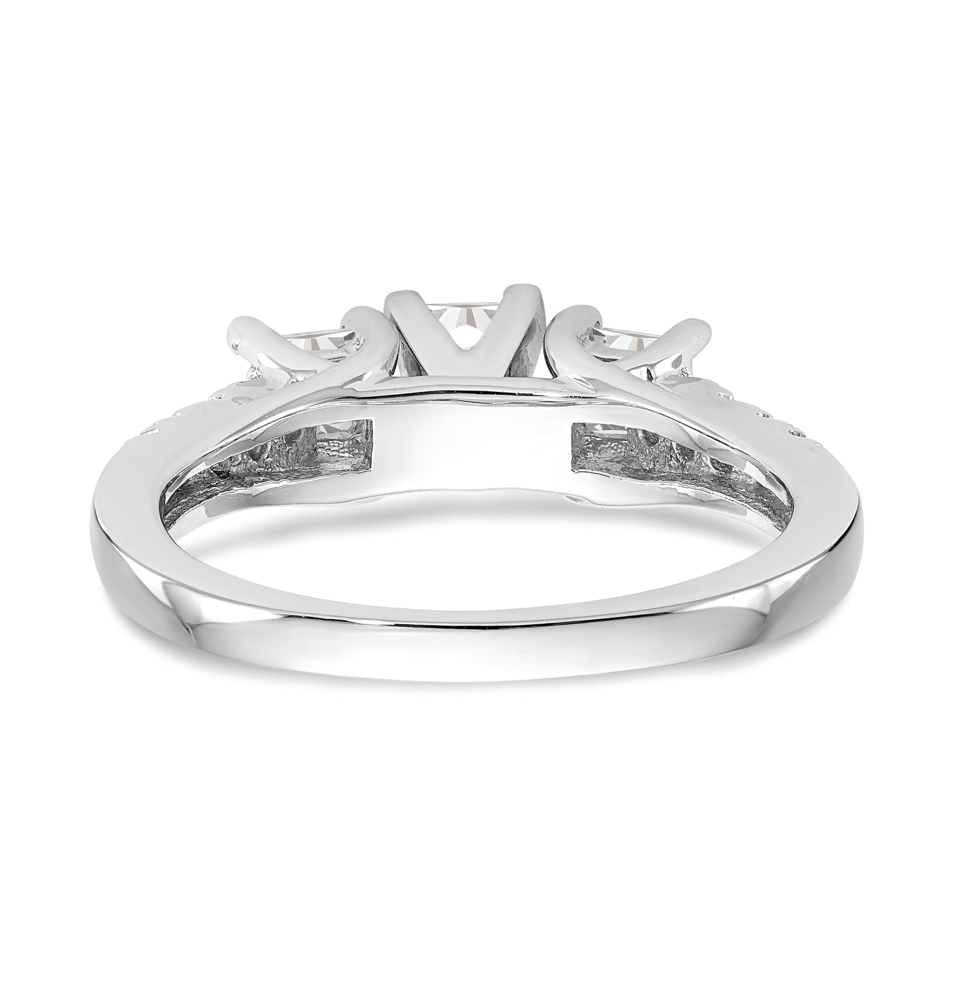 Meet the 14K White Gold 3-Stone Plus Peg Set Center Princess Diamond Semi-Mount Engagement Ring, a true symbol of love. Crafted from polished 14K white gold, this ring features a stunning center princess diamond of 0.5 carats, accented by two side stones and four small diamonds, all in crisp square and round shapes. Its tapered band ranges from 2.01 to 2.38 mm wide, ensuring comfort and style. The semi-mount design leaves room for your own touch, making it perfect for any bride-to-be. Dress up your special day with the timeless beauty of the 14K White Gold 3-Stone Plus Peg Set Center Princess Diamond Semi-Mount Engagement Ring.