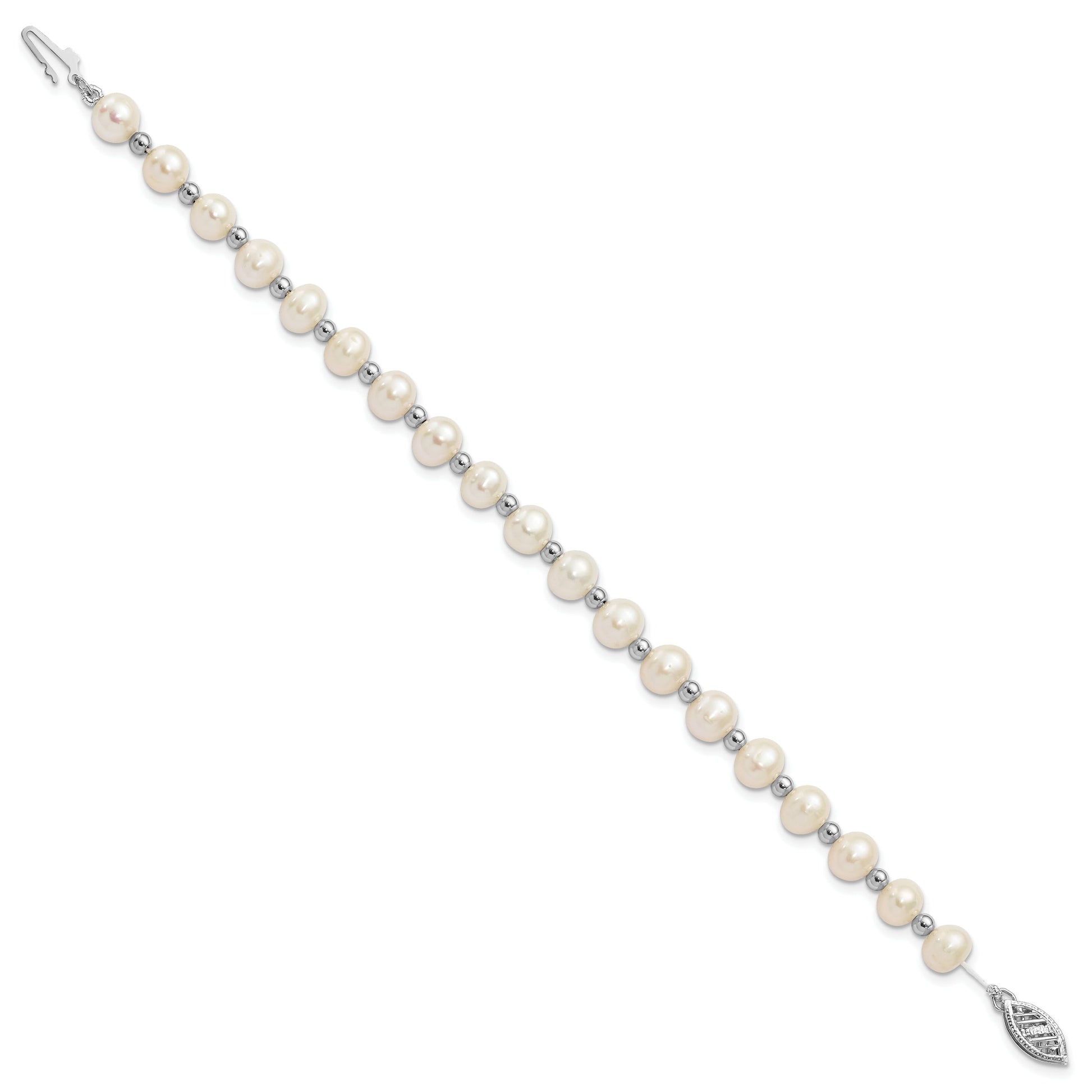 Introducing the 14K White Gold 6-7mm Near-Round Freshwater Cultured Pearl Beaded 7 Inch Bracelet. Crafted from high-quality 14K gold with a polished finish, this bracelet shines with a touch of elegance. It features beautiful, cultured freshwater pearls in a soft white hue, each 6 to 7 mm in size, arranged on a sturdy beaded chain. The rhodium plating adds extra luster, while the pearl clasp ensures easy wearing and secure fit. Perfect for adding a classy touch to any outfit, the 14K White Gold Pearl Bracelet is ideal for women who love timeless jewelry.