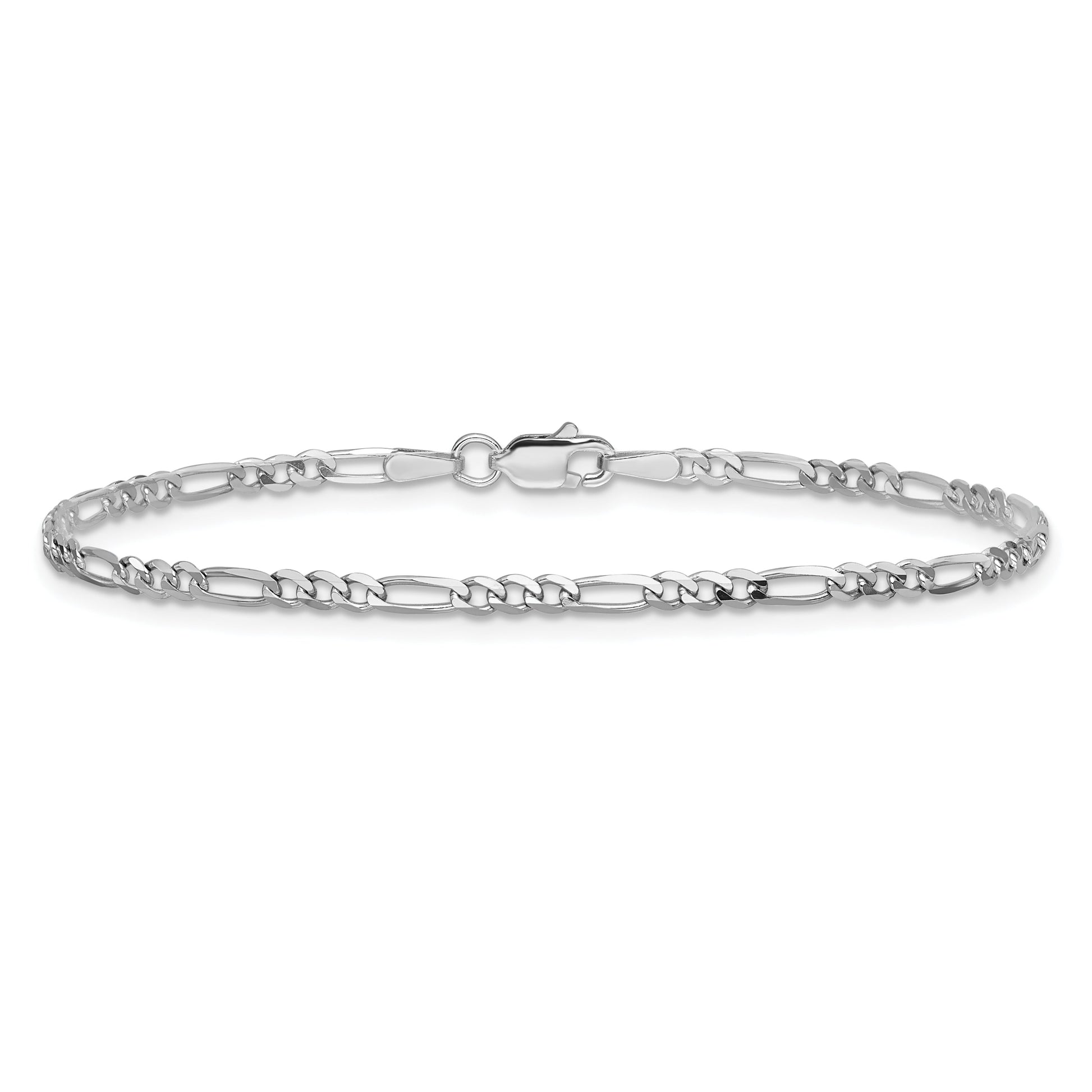 Elevate your style with this stunning 14K White Gold 9 Inch Flat Figaro Anklet. Crafted with care, this anklet features a sleek 2.25mm width and a polished finish for a timeless shine. The durable lobster clasp ensures a secure fit, while the rhodium plating adds an extra layer of brilliance and protection. Solidly cast, this anklet offers a luxurious feel that complements any wardrobe. Designed for women who appreciate elegance, this Figaro chain style adds a sophisticated touch to your ensemble. Treat yourself to this exquisite 14K White Gold 9 Inch Flat Figaro Anklet and dazzle with elegance.