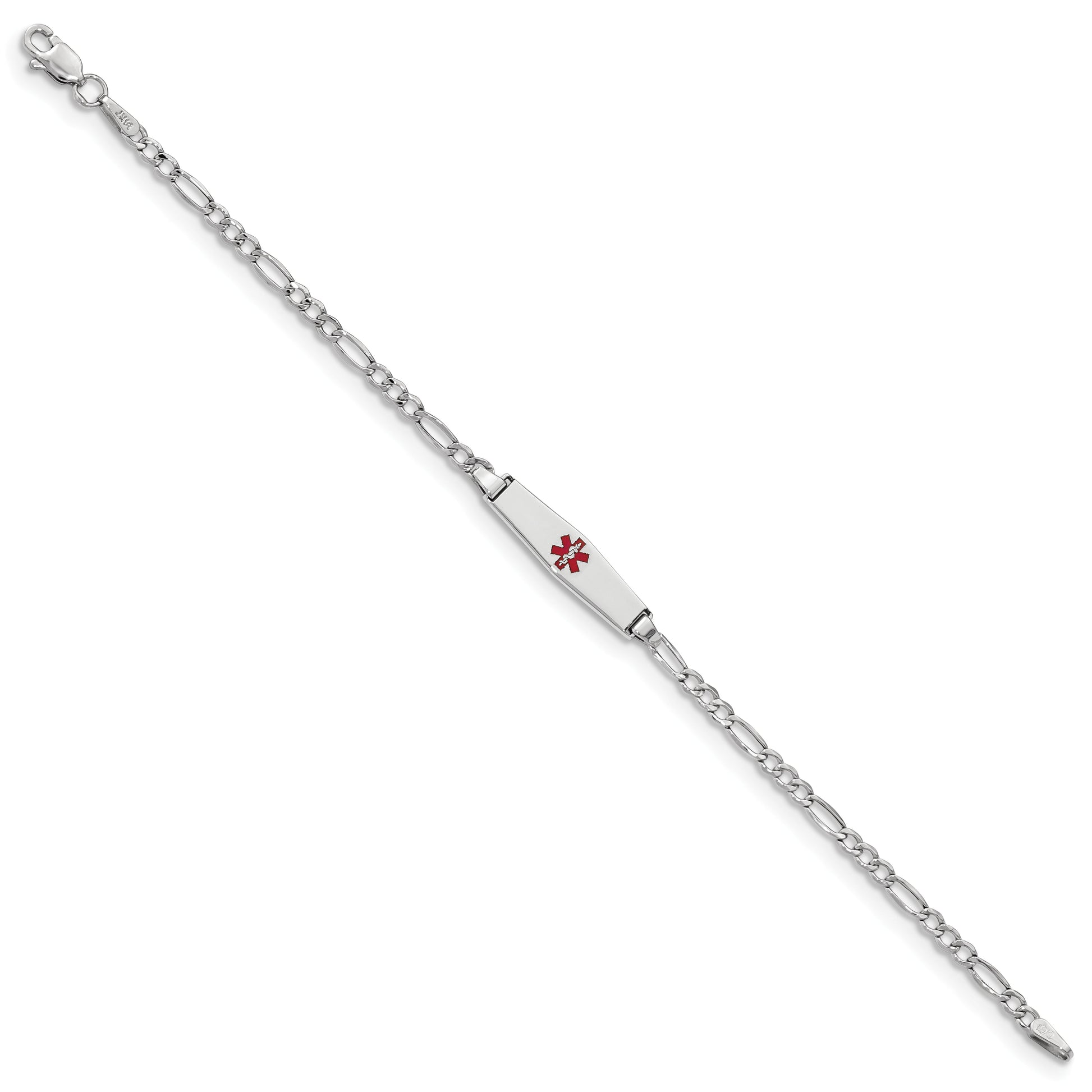 Introducing the 14K White Gold Medical Semi-Solid Chain Bracelets, crafted for kids with care. This 6-inch bracelet features a soft diamond-shaped red enamel charm at its center, making it both stylish and easy to spot in case of emergencies. The sturdy Figaro chain measures 2.5mm wide with a polished finish, and a secure lobster clasp keeps it in place. Its semi-solid design ensures durability, while the engravable surface adds a personal touch. Perfect as a medical alert bracelet for children, the 14K White Gold Medical Semi-Solid Chain Bracelet combines function with sleek, youthful style.