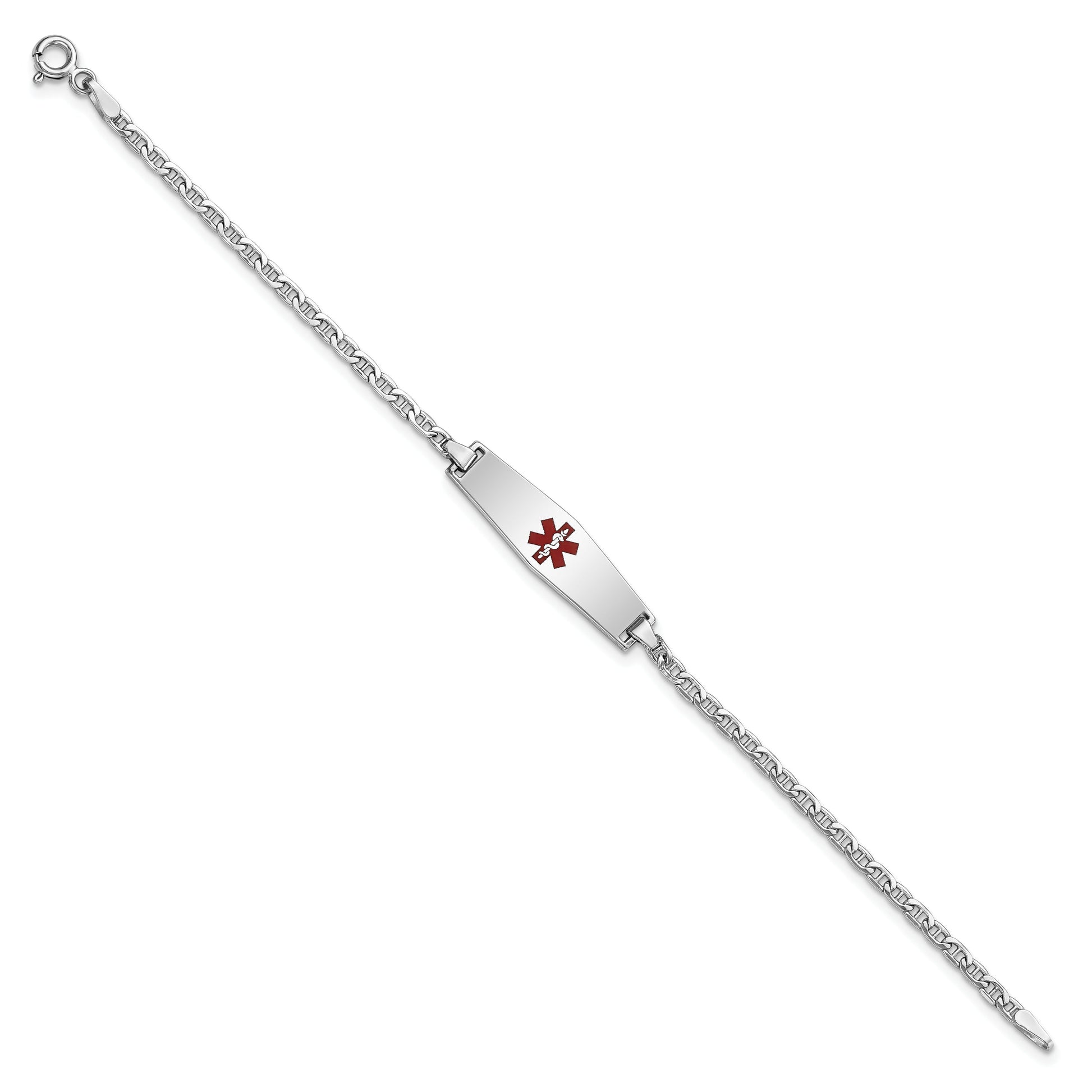 The 14K White Gold Medical Semi-Solid Chain Bracelet is a sleek choice for everyday wear. Crafted from polished 14K white gold, it features a sturdy anchor link design that measures 25x7mm. The bracelet includes a striking red enamel anchor charm with a soft diamond shape at its center, adding a pop of color. Its 7-inch length offers a snug fit, and the spring ring clasp ensures security. This unisex medical alert bracelet combines style and function while letting you add your own engraving. Perfect for those who value both form and safety.