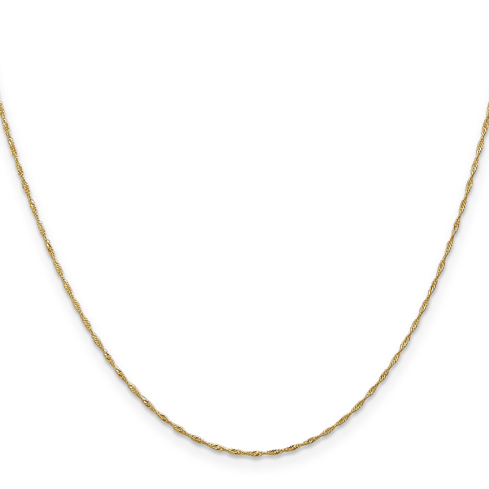 The 14K Yellow Gold 20 Inch 1mm Singapore Chain is a piece of elegance that every woman will love. Made from polished 14-karat gold, it shines with a warm yellow glow that complements any outfit. This 20-inch chain features a unique Singapore link design that's both intricate and strong. Measuring at 1mm in width, it offers a delicate appearance yet remains durable. It closes securely with a spring ring clasp, ensuring it stays safely in place. Add the 14K Gold Singapore Chain to your jewelry collection for a dash of timeless style.