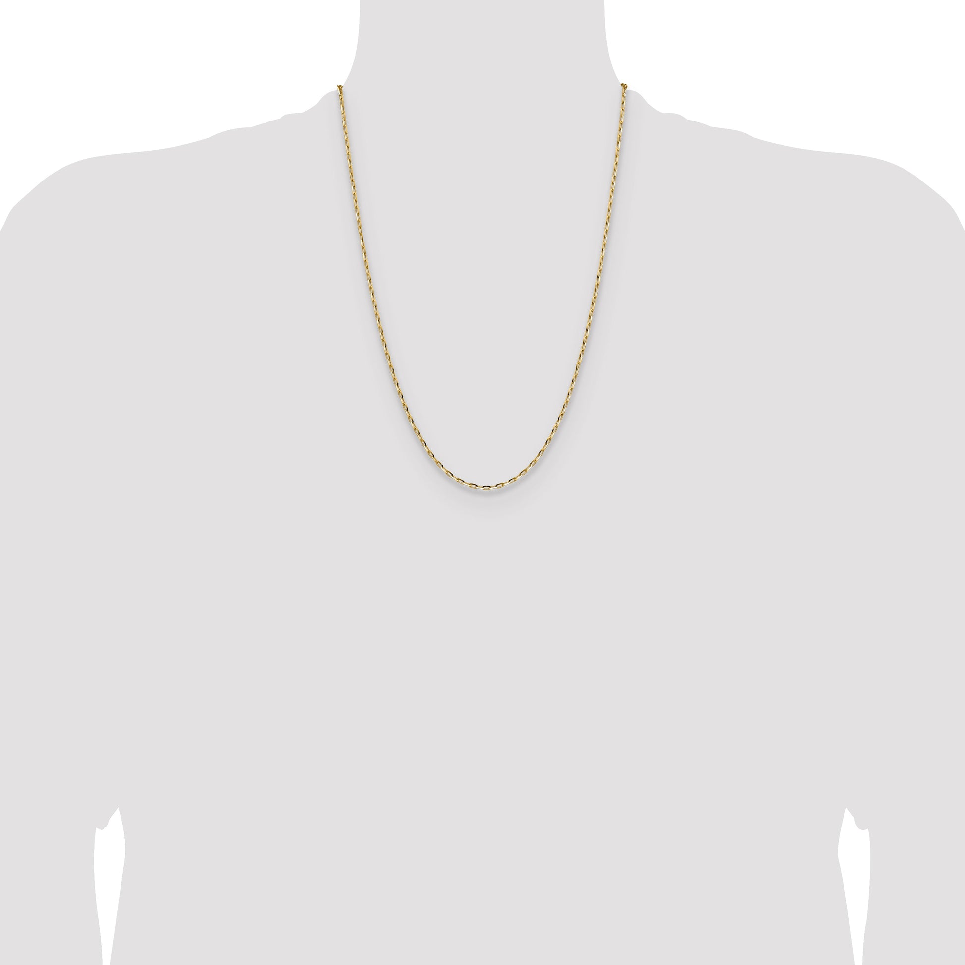 The 14K Yellow Gold 14K 2.3mm D/C Open Long Link Cable Chain is a standout piece that shows quality and style. Crafted from solid 14K gold, this necklace features a bright polish and a diamond-cut finish that catches the light easily. Its open link design gives a sleek, modern look, making it a versatile accessory for any outfit. The chain measures 24 inches with a sturdy lobster clasp for a secure fit. Durable and elegant, the 14K Yellow Gold 14K 2.3mm D/C Open Long Link Cable Chain offers lasting beauty with a lifetime guarantee, perfect for everyday wear or special occasions.