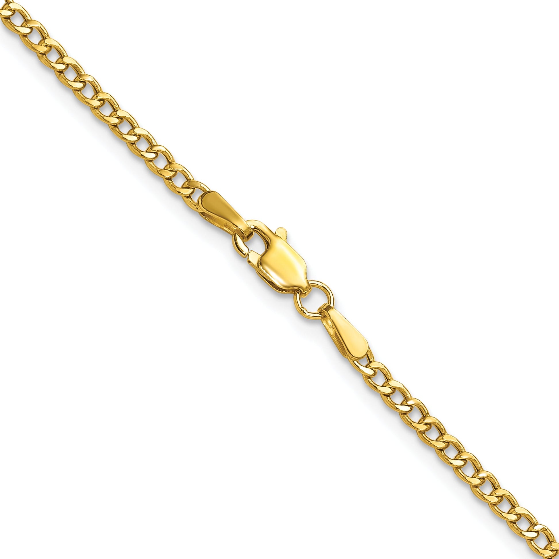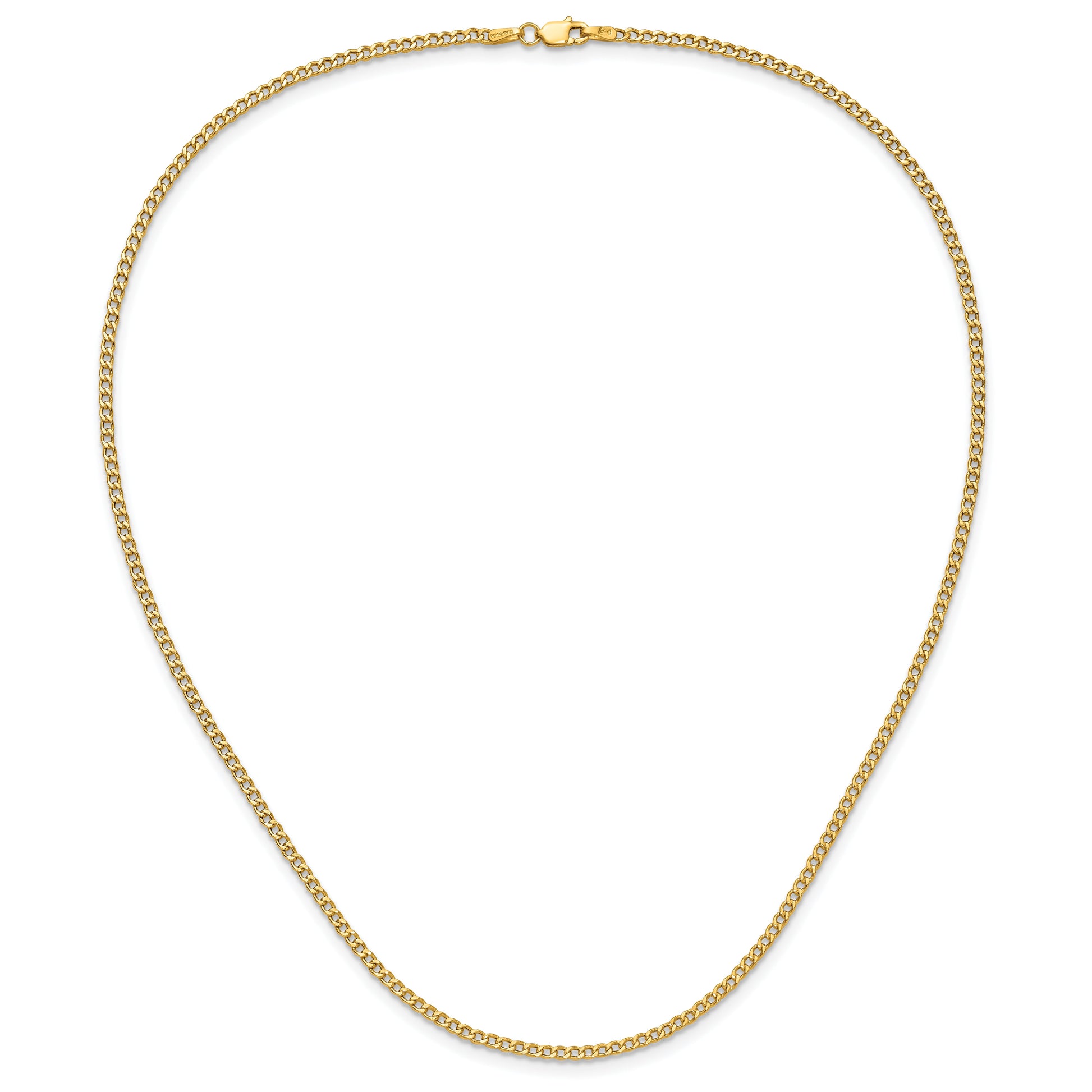 The 14K Yellow Gold 2.5mm Semi-Solid Curb Chain is a sleek and durable piece perfect for everyday wear. Crafted from pure 14K gold, it features a polished finish that offers shine and elegance. The chain measures 18 inches long with a sturdy 2.5mm curb link style, giving it a modern look. Its lobster clasp ensures secure closure so you can wear it with confidence. This gold chain adds a touch of class to any outfit, making it a versatile choice. The 14K Yellow Gold 2.5mm Semi-Solid Curb Chain comes with a lifetime guarantee for lasting quality.