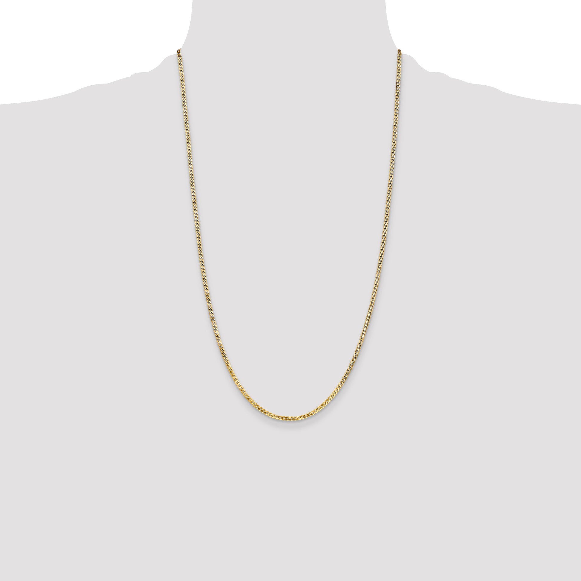 The 14K Yellow Gold 26-Inch Flat Beveled Curb with Lobster Clasp Chain elegantly combines timeless style and lasting luxury. Engineered from solid 14K yellow gold, this chain boasts a flat profile with a beveled edge that adds a polished touch to any look. Measuring 26 inches in length, it drapes perfectly around the neck, highlighting the classic curb chain design. With a width of 2.2mm, it makes a subtle yet notable statement. The lobster clasp provides secure fastening, ensuring both convenience and reliability. This piece of jewelry speaks to women who value sophistication and craftsmanship.