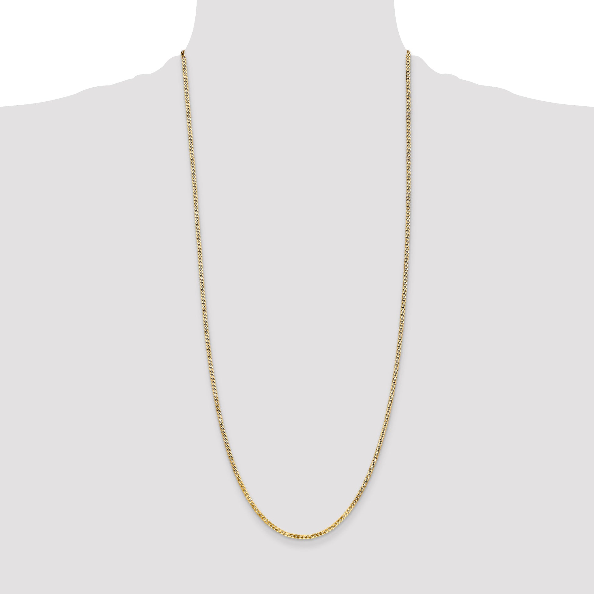 Step out in style with the 14K Yellow Gold 30 Inch 2.2mm Flat Beveled Curb Chain. This stunning necklace shines with its polished finish and rich yellow hue. Crafted from genuine 14K gold, the chain offers strength and longevity. Its flat beveled edge gives it a sleek, modern look, perfect for any outfit. The lobster clasp ensures a secure fit, providing peace of mind as you go about your day. Measuring a generous 30 inches in length, the 14K Yellow Gold Flat Beveled Curb Chain complements any neckline with refined elegance.