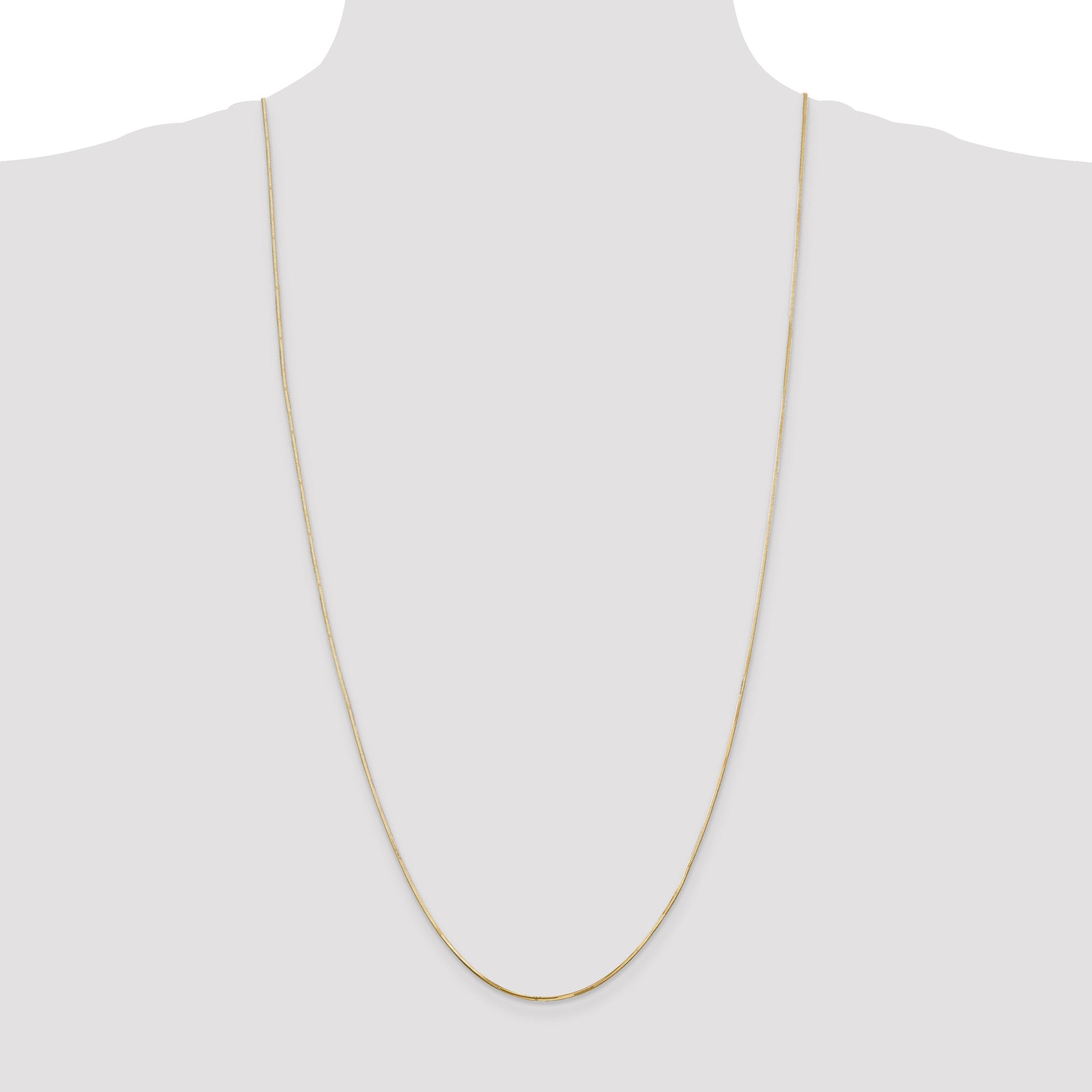 The 14K Yellow Gold 30 Inch 0.9mm Octagonal Snake Chain offers a classic blend of style and elegance. Crafted from high-quality 14K yellow gold, this polished chain measures 30 inches in length, making it ideal for various necklines. The snake design, known for its sleek finish and flexibility, allows for comfortable wear. The chain's 0.9mm width ensures lightweight durability without sacrificing any sophistication. Equipped with a sturdy lobster clasp, it promises secure fastening. Impressively made using extruded and die-struck processes, this chain highlights every outfit with its diamond-cut texture. Embrace timeless beauty with this distinguished 14K Yellow Gold Octagonal Snake Chain.