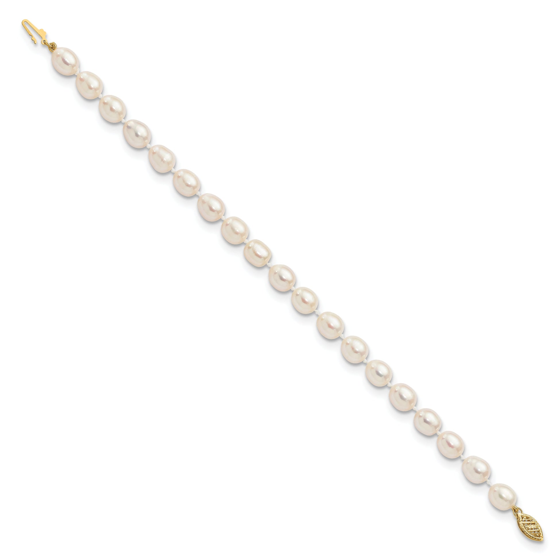 14K Yellow Gold 7 8mm White Rice Freshwater Cultured Pearl 7.5 Inch Bracelet