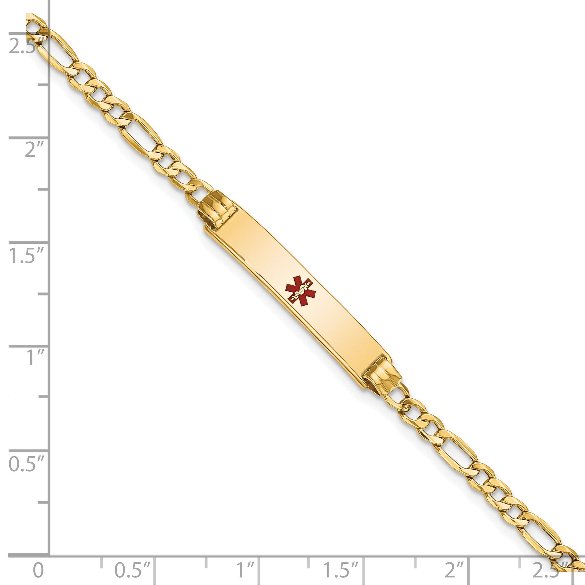 The 14K Yellow Gold 14K Medical Semi-Solid Chain/Solid Plate 26X5mm Centered Red Enamel Figaro Link 7 Inch ID Bracelet is a stylish piece with bold charm. It features a polished, yellow gold chain with a comfortable seven-inch length. The eye-catching red enamel accent adds a pop of color, perfect for everyday wear. The bracelet's sturdy lobster clasp ensures a secure fit. Designed for both men and women, this medical alert bracelet offers a sleek look and practical function. Crafted from high-quality gold, the 14K Yellow Gold 14K Medical Semi-Solid Chain/Solid Plate 26X5mm Centered Red Enamel Figaro Link 7 Inch ID Bracelet makes a bold style statement and keeps your health info safe.