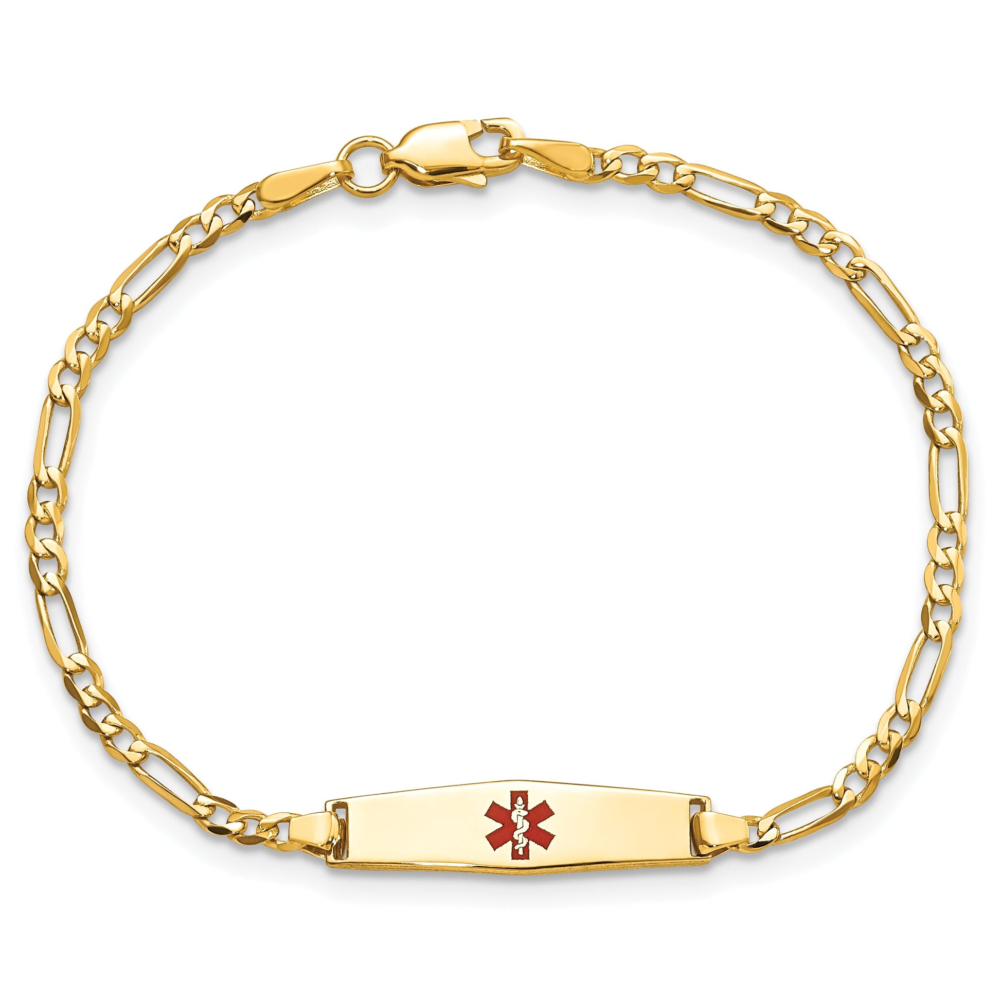 The 14K Yellow Gold Medical Solid Chain/Bracelet is crafted for kids and features a sleek 6-inch design. Its soft diamond-shaped red enamel center adds a bright pop of color, making it stand out. The sturdy Figaro link measures 20x5mm, ensuring durability. The bracelet has a solid 14K gold build, polished finish, and a secure lobster clasp. With a small charm that can be engraved and a stylish red accent, this medical alert bracelet combines safety with a chic look. The perfect choice for young ones, the Jewelry Proper 14K Yellow Gold Medical Solid Chain Bracelet offers both function and style in one neat package.