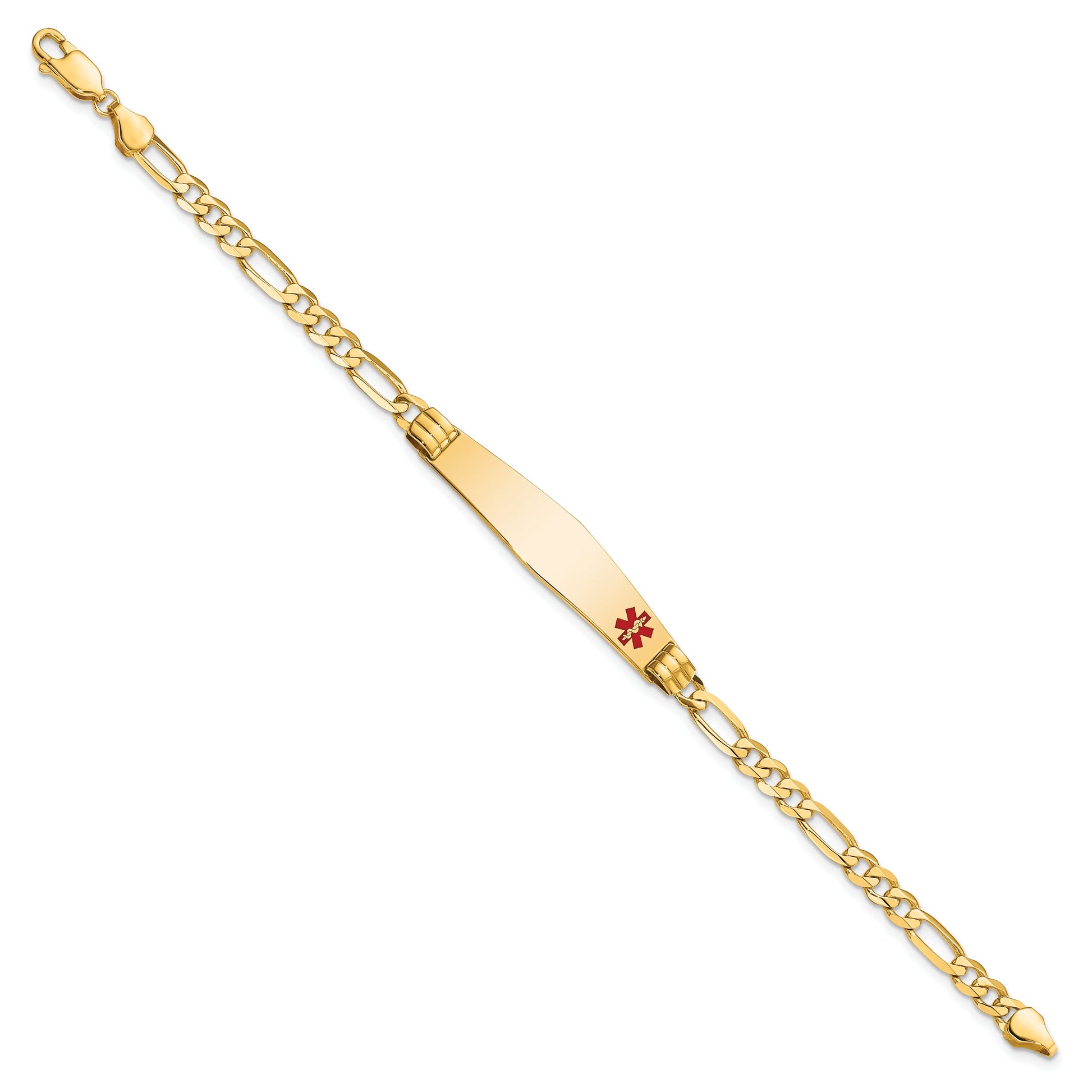 Discover the beauty of the 14K Yellow Gold 14K Medical Solid Chain with the Off-Center Red Enamel Figaro link. Crafted from polished 14K gold, this 8-inch bracelet offers a sleek look with its solid design and a 36x9mm soft diamond-shaped charm. The eye-catching red enamel detail adds a pop of color, while the lobster clasp ensures a secure fit. Perfect for everyday wear, this unisex bracelet is both stylish and practical. The medical alert feature makes it a must-have item for those who want safety and style in one. The 14K Yellow Gold 14K Medical Solid Chain bracelet truly combines function with elegance.
