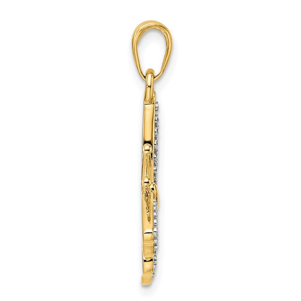 This charming pendant is crafted from 14k yellow and rhodium gold, with a weight of 4.09 grams. The material is polished to a sleek finish, with a length of 30mm and width of 22.1mm. A white rhodium accent adds a pop of contrast, with a diamond-cut texture adding a touch of sparkle. The butterfly design is casted in solid form, with a flat back profile and bail measuring 4.63mm in width and 6.98mm in length. While engraving is not recommended, this pendant makes a standout addition to any collection. Sold by unit, this themed piece serves as a beautiful jewelry type pendant or charm.