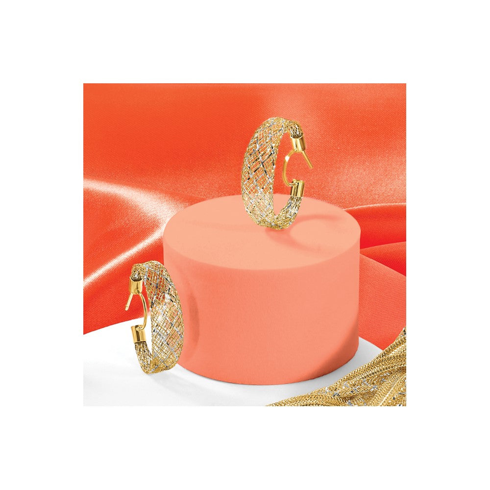 Introducing the 14K Yellow & Rhodium Braided Mesh Stretch Post Hoop Earrings, a perfect blend of style and comfort. These lightweight earrings measure 26.5 mm and feature a sleek braided mesh design with a shiny polish finish. Crafted from genuine 14K gold with rhodium accents, they add a bright touch to any look. The hoop style is easy to wear with a secure post and push back closure. Whether dressing up or down, the durable 14K gold and silver-tone plating ensure lasting shine. The 14K Yellow & Rhodium Braided Mesh Stretch Post Hoop Earrings are a standout choice for women who love quality jewelry that’s both trendy and timeless.