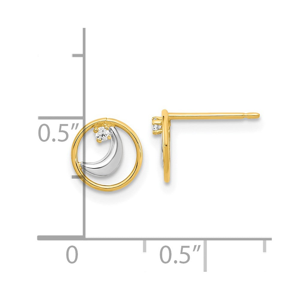 Introducing the 14K Yellow & Rhodium 14K Gold White Open Circle CZ Half Moon Post Earrings, a stunning piece of jewelry that adds sparkle and style to any look. Crafted with high-quality 14K gold, these earrings feature a shiny polished finish and white cubic zirconia stones that catch the light beautifully. The open circle design and half moon shape give them a modern, yet elegant vibe. Their small size makes them perfect for everyday wear, while the secure post and push back keep them in place all day. The 14K Yellow & Rhodium 14K Gold White Open Circle CZ Half Moon Post Earrings offer a sleek blend of class and fun for anyone who loves to shine.