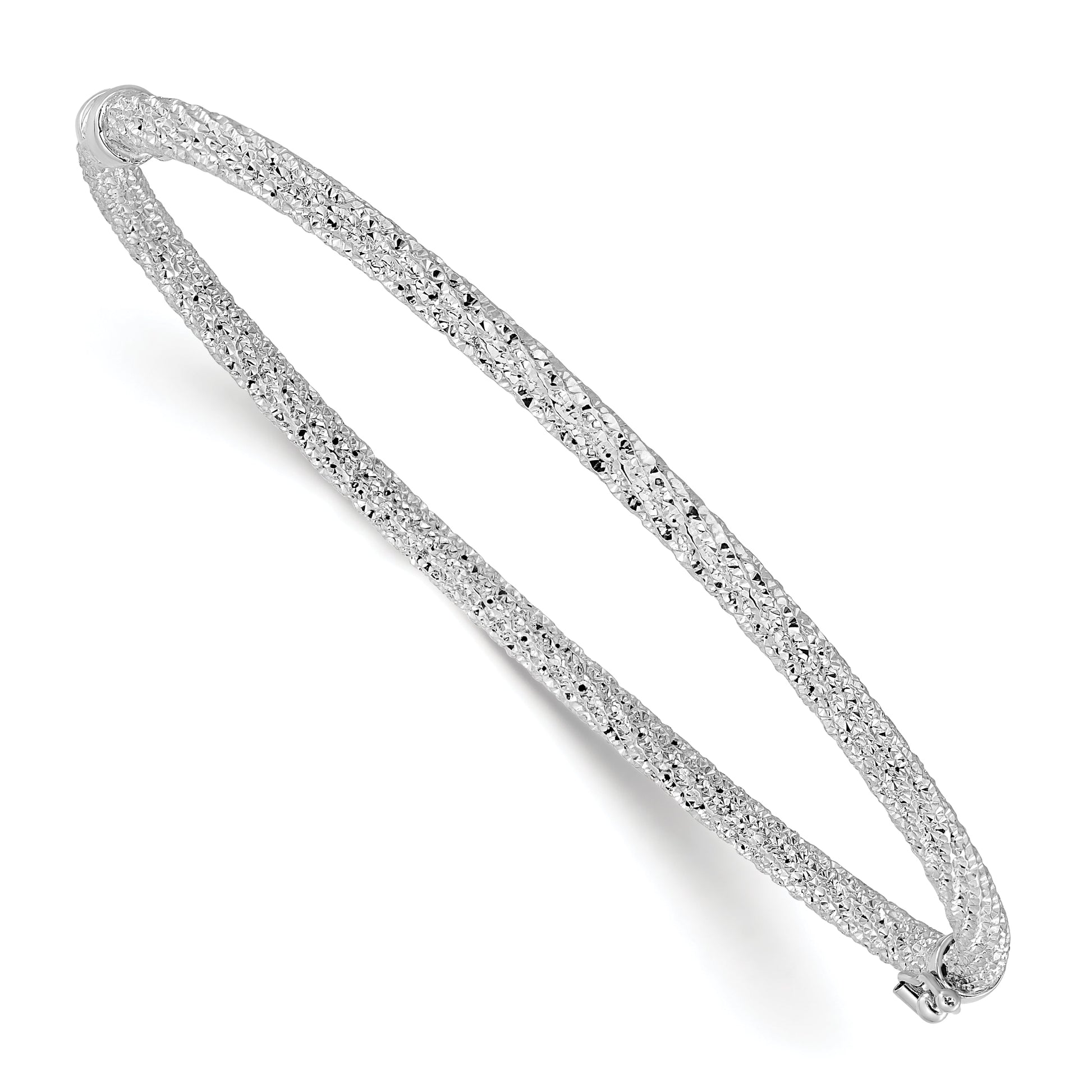 The 14K Yellow & Rhodium W/Rh-Plat Polish/Texture/Dia-Cut Twist Hinged Bangle is a stunning piece of jewelry that adds a touch of elegance to any woman's look. Crafted from pure 14K gold with a polished finish and intricate laser designs, it features a shimmering rhodium coating for extra shine. The diamond-cut texture and twist design create a unique visual appeal. A secure box catch with a safety clasp ensures it stays put comfortably. This hinged bangle is lightweight, stylish, and built to last with a lifetime guarantee, making it a perfect addition to your jewelry collection.