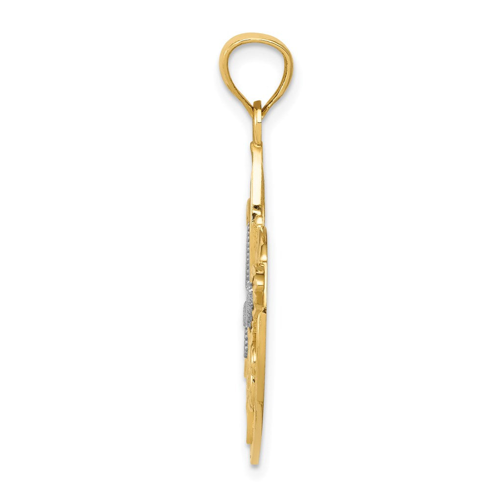 This breathtaking pendant boasts a combination of 14k yellow and rhodium gold, giving it a stunning two-tone appearance. The design features a diamond-cut polished butterfly heart, creating a unique and eye-catching look. The pendant is solid, ensuring durability and longevity. Measuring 32.4mm in length and 24.3mm in width, this themed pendant is the perfect addition to any jewelry collection. It has a flat back profile and features a 5.5mm bail width and a 6.5mm bail length. Crafted using the casting manufacturing process, this pendant is of the highest quality. Incorporating accents of rhodium, which is a white material, this piece of jewelry is sure to turn heads. Weighing 2.53 grams, this elegant pendant is sold individually and promises to be a cherished item for years to come.