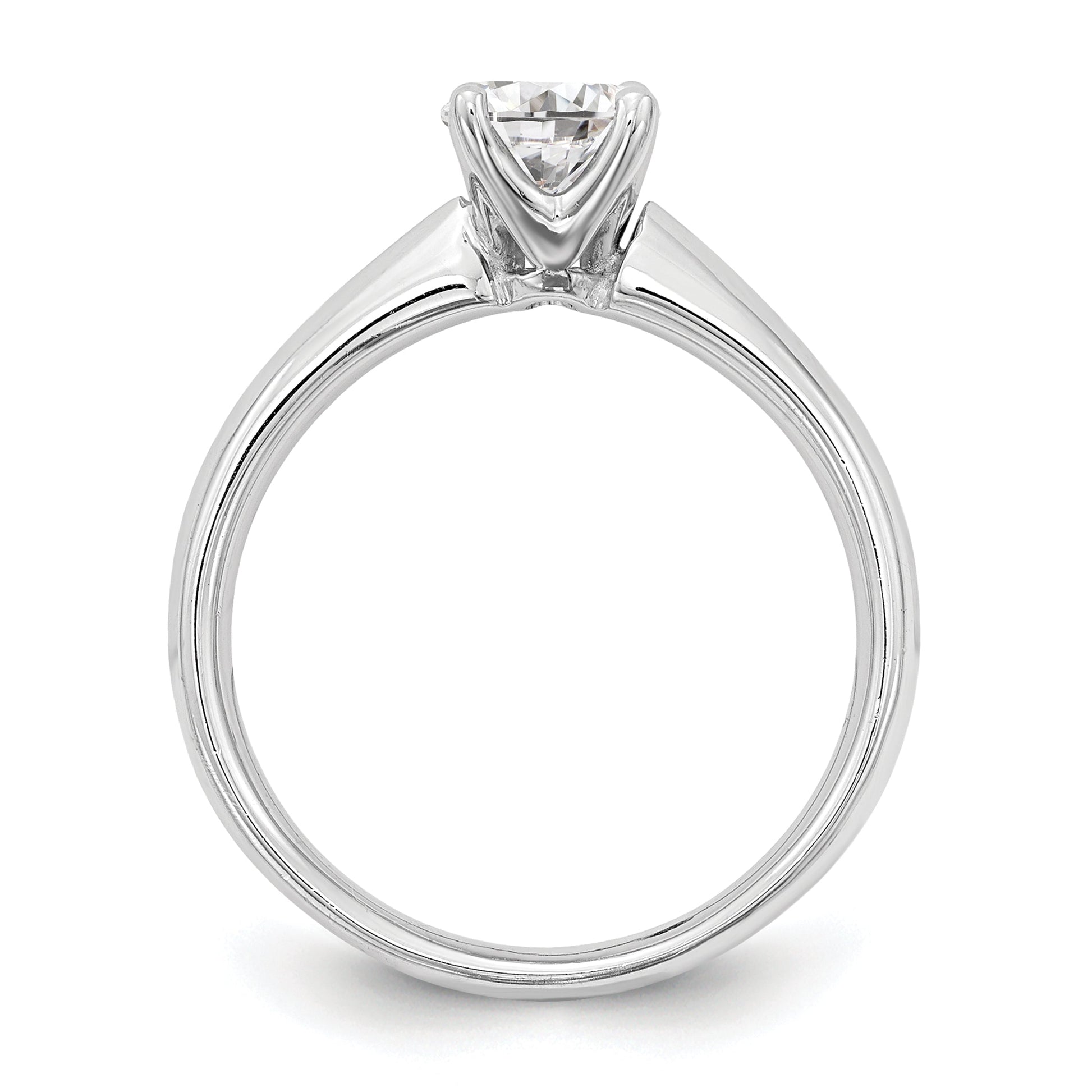 The 14K gold ring features a band width of 3.5mm and its center stone is round-shaped and measures 8.2mm, with a total stone quantity of 1, weighing 2ct. The head height is 8.9mm and is 4-pronged. The ring is sizeable and customizable from 5 to 9. The manufacturing process is casted and has a polished finish with a plating of rhodium for an extra layer of protection.