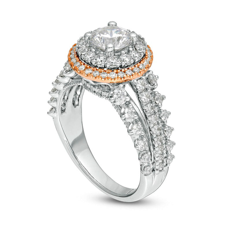 Captivate her heart with this absolutely stunning diamond engagement ring. Crafted in exquisite 14K two-tone gold, this opulent design features a breathtaking 1 ct. diamond held by two diamond-crowned frames - one in white gold and the other in rose gold. The triple-row shank boasts a center row of diamonds flanked by scalloped borders of diamonds set in intricately sculpted mounts, adding to its brilliance. Delicate milgrain-lined ribbons and diamonds adorn the gallery and sides, amplifying the charm of this magnificent beauty. Elegant with 2 cts. t.w. of diamonds and a magnificent buffed luster, this masterpiece of an engagement ring is truly exceptional.