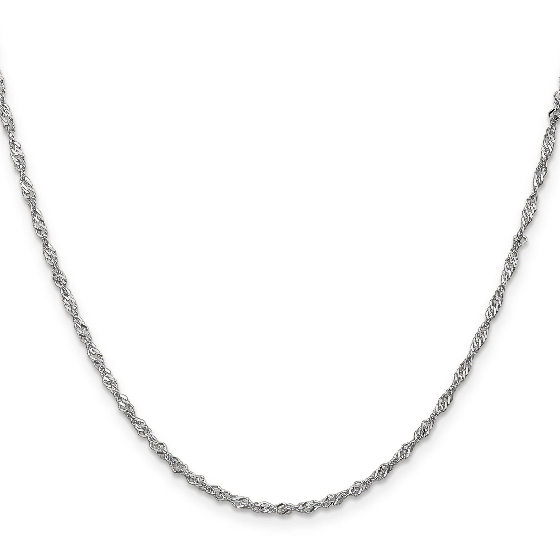Introducing the 24 Inch 14K White Gold 1.6mm Singapore Chain, a fine piece of jewelry that effortlessly adds elegance to any outfit. Crafted from pure 14K white gold, this chain boasts a polished finish, ensuring a lasting shine. The chain's 1.6mm width offers a delicate yet noticeable presence, perfect for everyday wear or special occasions. With a length of 24 inches, it drapes gracefully around the neck, secured by a durable lobster clasp. Experience timeless beauty with this meticulously crafted Singapore chain, a must-have for any jewelry collection.