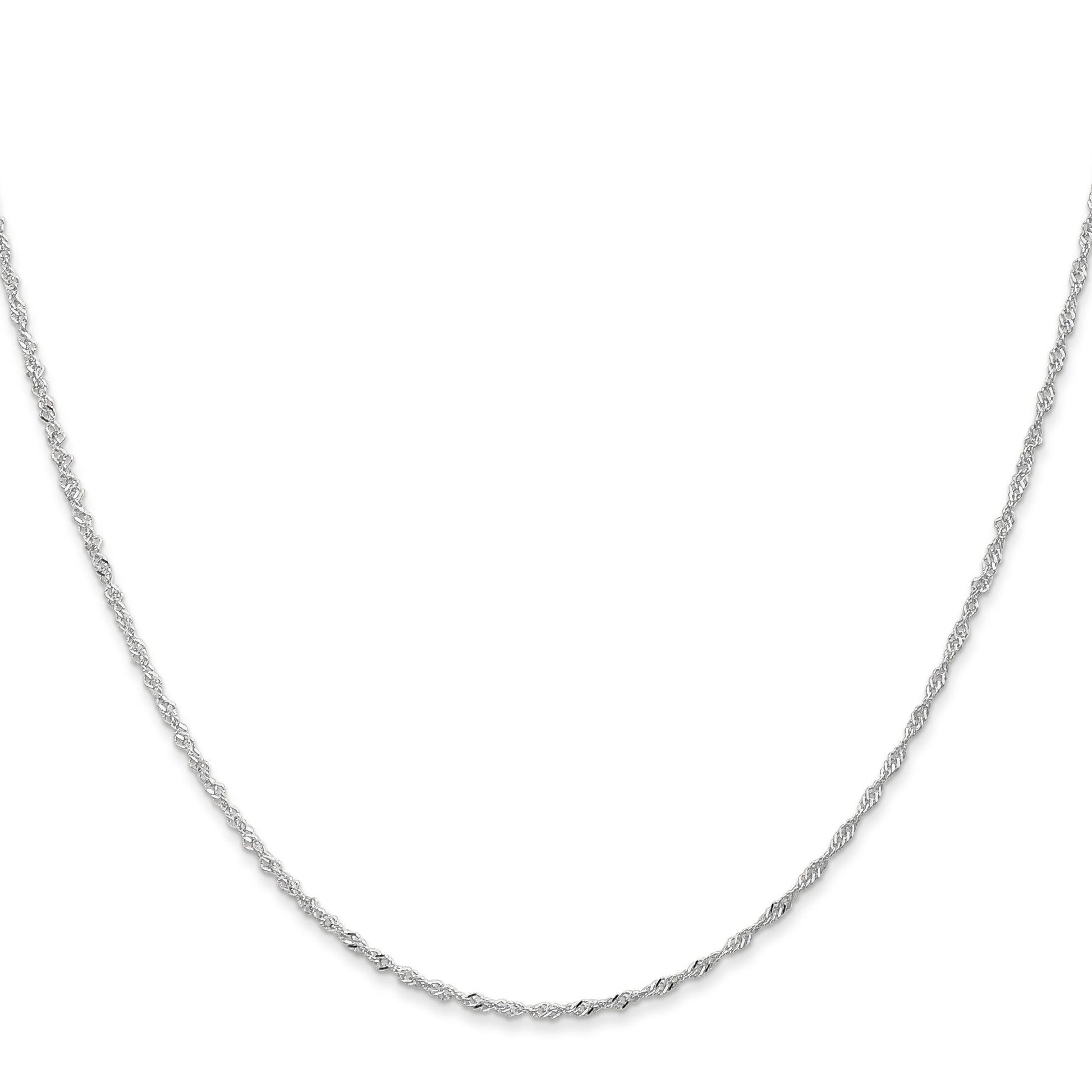 The 24 Inch 14K White Gold 1mm Singapore Chain with Lobster Clasp is a stunning piece of fine jewelry. This chain, crafted from pure 14K white gold, offers a polished finish that gleams with elegance. With a length of 24 inches and a width of 1mm, its Singapore chain design adds a touch of sophistication. The durable lobster clasp ensures secure wear, while the rhodium plating protects the chain, keeping it lustrous. This exquisite 14K White Gold Singapore Chain is both timeless and stylish, perfect for everyday wear or special occasions.