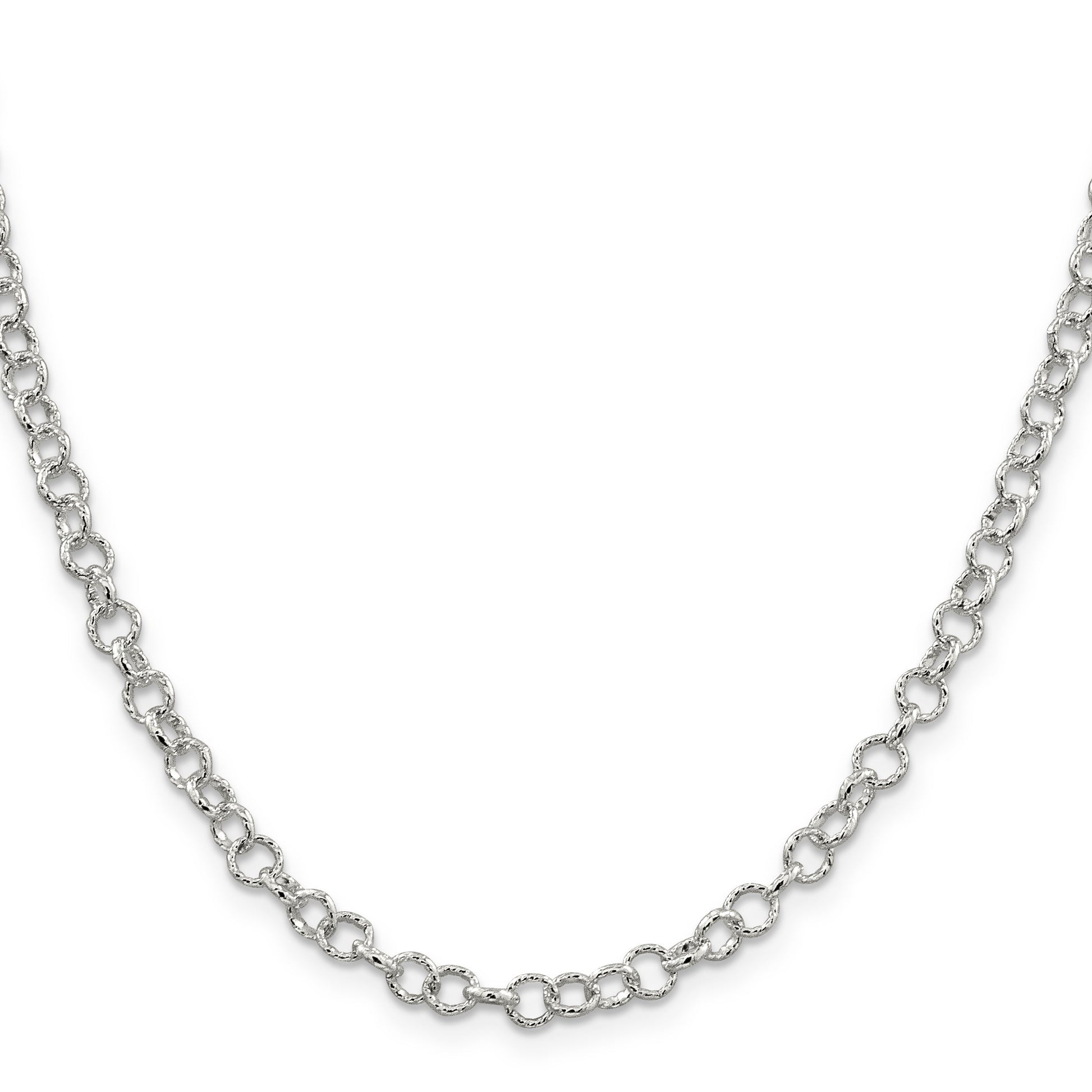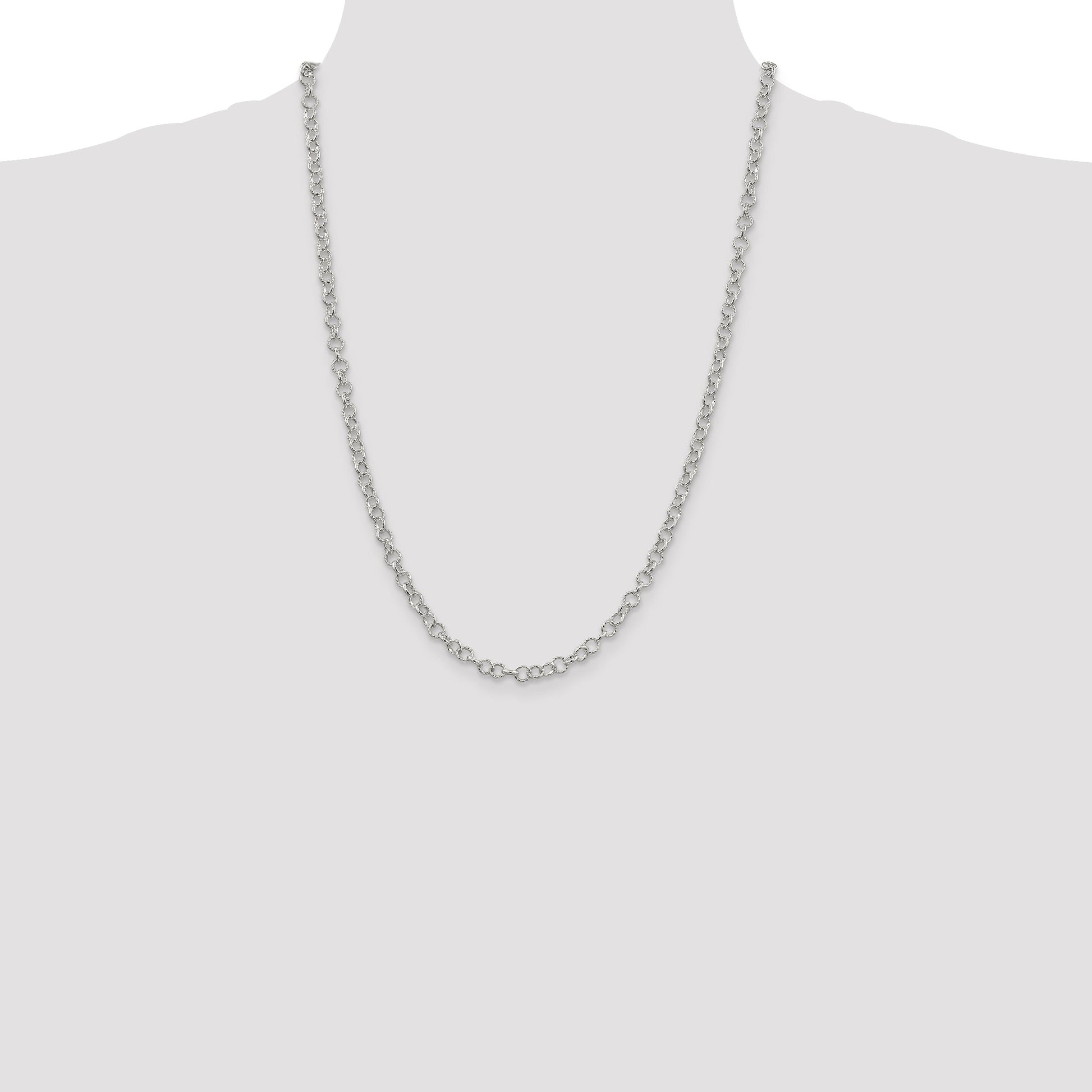 Embrace elegance with the stunning 24 Inch Sterling Silver 4.55mm Fancy Patterned Rolo Chain. Crafted by hand with solid sterling silver, this necklace gleams with a polished finish and white hue. Its robust 4.55mm width and intricate rolo chain pattern offer both strength and beauty. Perfect for any outfit, this piece provides durability with anti-tarnish coating. The lobster clasp ensures secure wear, making it an everyday luxury. Experience the blend of style and craftsmanship with this 24 Inch Sterling Silver 4.55mm Fancy Patterned Rolo Chain, designed for those who appreciate fine jewelry.