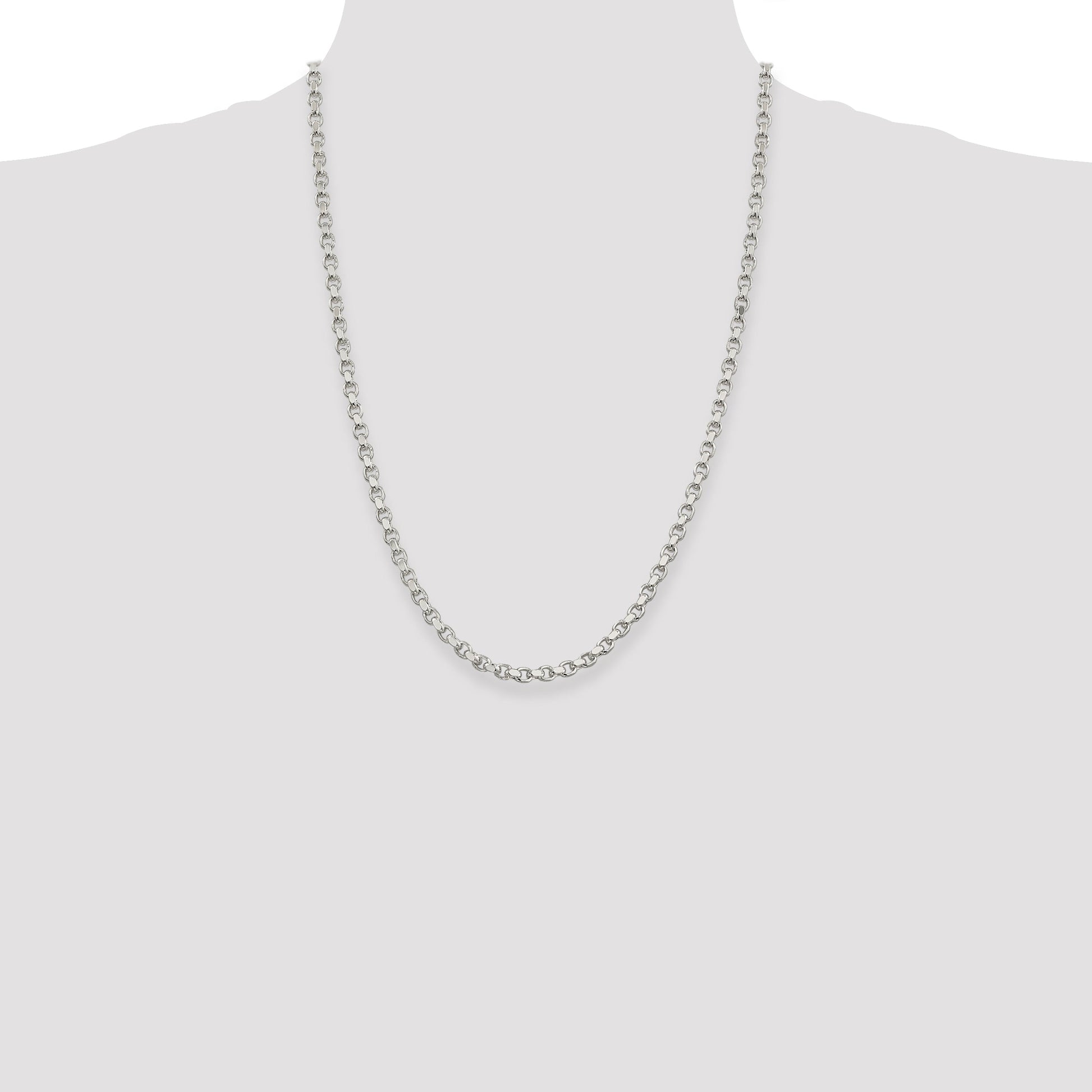 This 24 Inch Sterling Silver Diamond-Cut Rolo Chain is a stunning piece, expertly crafted for elegance and durability. Made from pure 925 sterling silver, this necklace glimmers with a polished finish and a white color that complements any outfit. The diamond-cut texture on the 4mm wide links catches the light beautifully, adding sparkle and shine. The chain is robust, featuring an anti-tarnish coating to maintain its luster and a secure lobster clasp for easy wear. A timeless accessory, the 24 Inch Sterling Silver Diamond-Cut Rolo Chain is ideal for women seeking both style and sophistication.