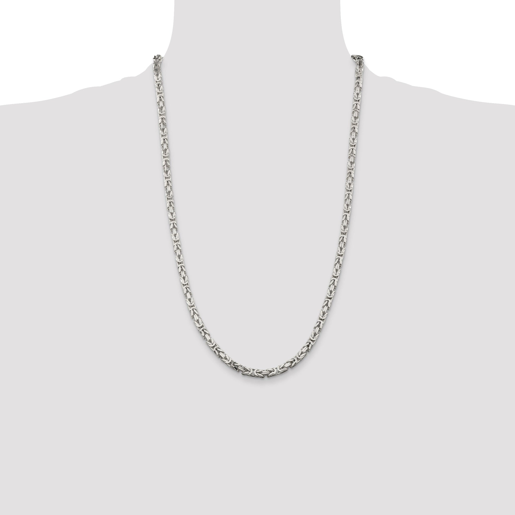 Introducing the 26 Inch Sterling Silver 4.25mm Byzantine Chain, a blend of elegance and durability. Crafted from pure 925 sterling silver, this polished beauty showcases the intricate and classic Byzantine design that holds timeless appeal. With a robust 4.25mm width, this chain commands attention and elevates any attire. The convenient lobster clasp ensures secure wear. Perfect for women who appreciate fine jewelry, this machine-made piece stands the test of time while adding a touch of glam. The 26 Inch Sterling Silver 4.25mm Byzantine Chain makes a chic and enduring addition to your collection.