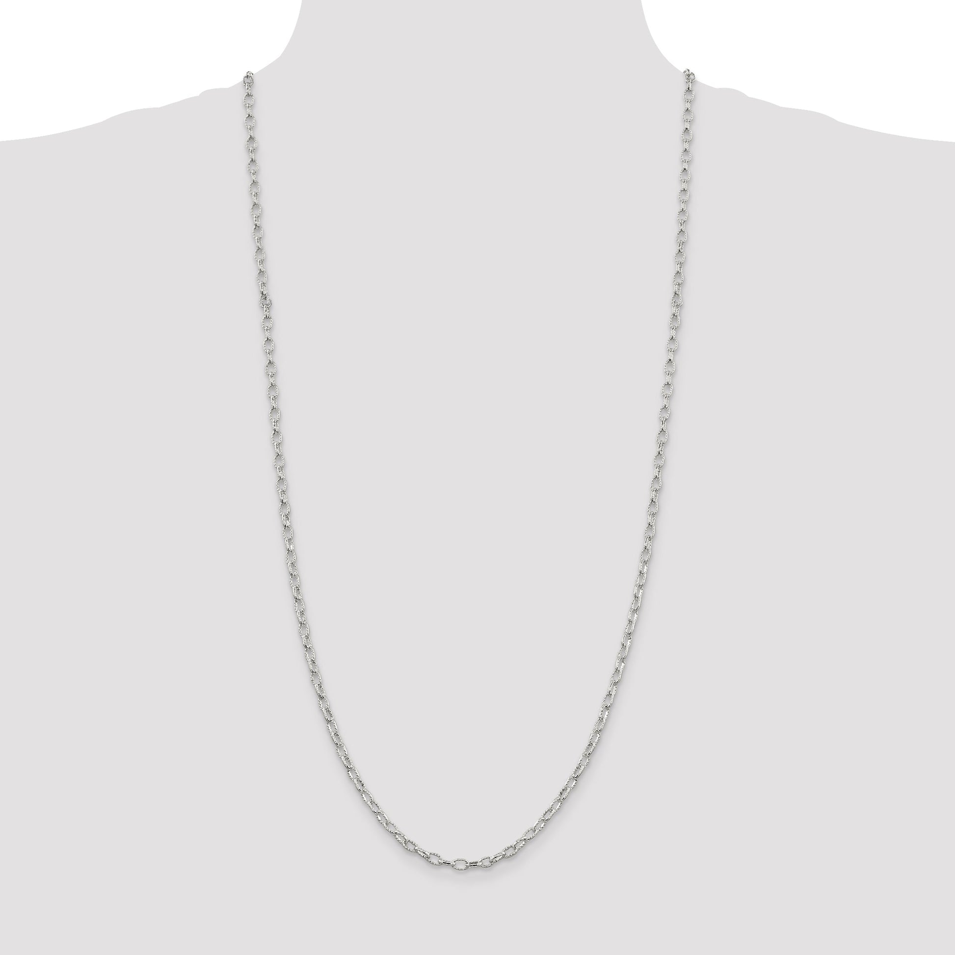 This 30-inch Sterling Silver 3.75mm Fancy Patterned Rolo Chain is a gem in the world of jewelry. Handcrafted with 925 sterling silver, it features a polished finish that adds a hint of sophistication to any attire. The fancy pattern elevates its style and charm. With a secure lobster clasp and a solid, durable construction, this Rolo chain is perfect for daily wear. It’s 3.75mm width gives it a substantial look without being overpowering. Whether you're dressing up or keeping it casual, the 30 Inch Sterling Silver 3.75mm Fancy Patterned Rolo Chain is a timeless piece that complements any wardrobe.