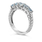 Experience timeless elegance with this stunning vintage-style ring featuring five icy-blue, 4.0mm aquamarines set in lustrous sterling silver. The intricate milgrain detailing and sculpted stepped pattern on the shank add heirloom appeal, making this ring perfect for any occasion. Available in select sizes, this exquisite ring is a classic addition to any jewelry collection. Please note that sterling silver rings cannot be resized after purchase. Enjoy this exquisite gemstone ring, brilliantly buffed to a gorgeous shine.