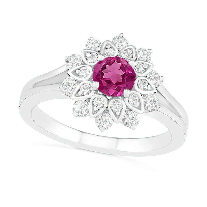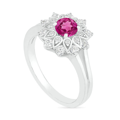 Revitalize your accessory collection with this sophisticated flower ring. Crafted from high-quality sterling silver, this exquisite piece showcases a 5.0mm lab-created pink sapphire that serves as the centerpiece of a...