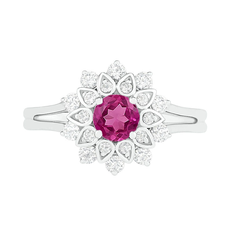 Revitalize your accessory collection with this sophisticated flower ring. Crafted from high-quality sterling silver, this exquisite piece showcases a 5.0mm lab-created pink sapphire that serves as the centerpiece of a flower-shaped frame embellished with lab-created white sapphires. The split shank adds a touch of elegance to the overall design. This ring features a timeless style that is sure to become your go-to accessory for any occasion. Custom-made to fit your finger size, this ring cannot be resized after purchase. Its lustrous finish further enhances its overall appeal.
